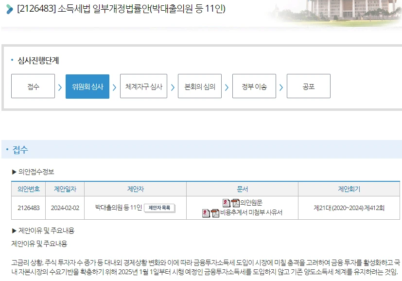 현재 금투세 폐지 내용을 담은 소득세법 개정안과