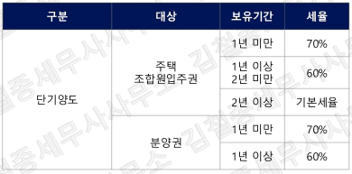 주택을 2년 미만 보유한 상태에서 양도 시에는 단기 양도에 해당되어 60% 또는 70% 의 단일세율이 적용될 수 있다.