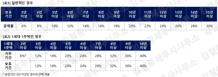 이처럼 1세대 1주택자에 해당되면 종부세 부담이 크게 줄어들텐데, 과세기준일(6월 1일) 기준으로 1주택과 상속개시일로부터 5년이 지나지 않은 상속주택을 보유한 상태라면 1세대 1주택자로 보아 12억원 공제, 보유기간 및 연령 세액공제 등을 적용받을 수 있다.