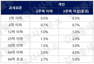 다만, 과세표준 12억 이하까지는 2주택 이하, 3주택 이상 여부에 관계없이 동일한 세율이 적용되므로, 시세로 대략 15억 정도 내외의 주택을 3채 이상 소유한 경우가 아니라면 중과세율 적용에 따른 추가 종부세 부담 등 영향은 없어 보인다.