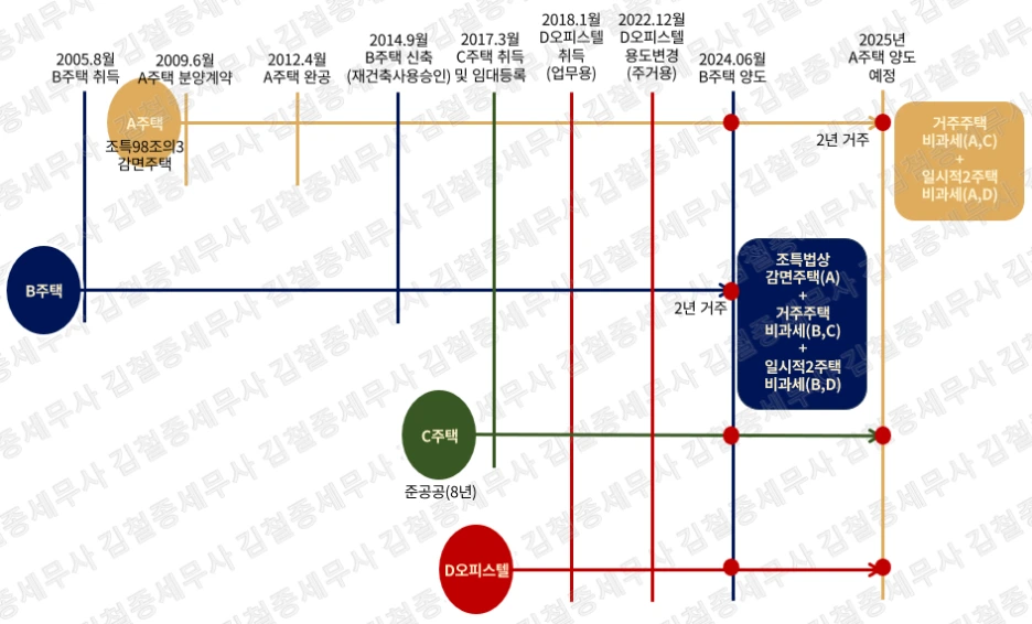 이렇게 B주택을 매각하면서 비과세를 적용받고 A주택, C주택, D주택. 이렇게 3채만 남은 상태에서, A주택에 들어가 2년 이상 거주한 뒤에 다시 A주택을 매각한다고 가정해보자.
