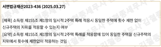 이에 미뤄볼 때, 국세청은 양도 시점에 세법에서 정해놓고 있는 일시적 2주택 비과세 특례 요건을 충족하기만 한다면 횟수에 제한없이 계속하여 적용이 가능하다는 입장으로 보인다.