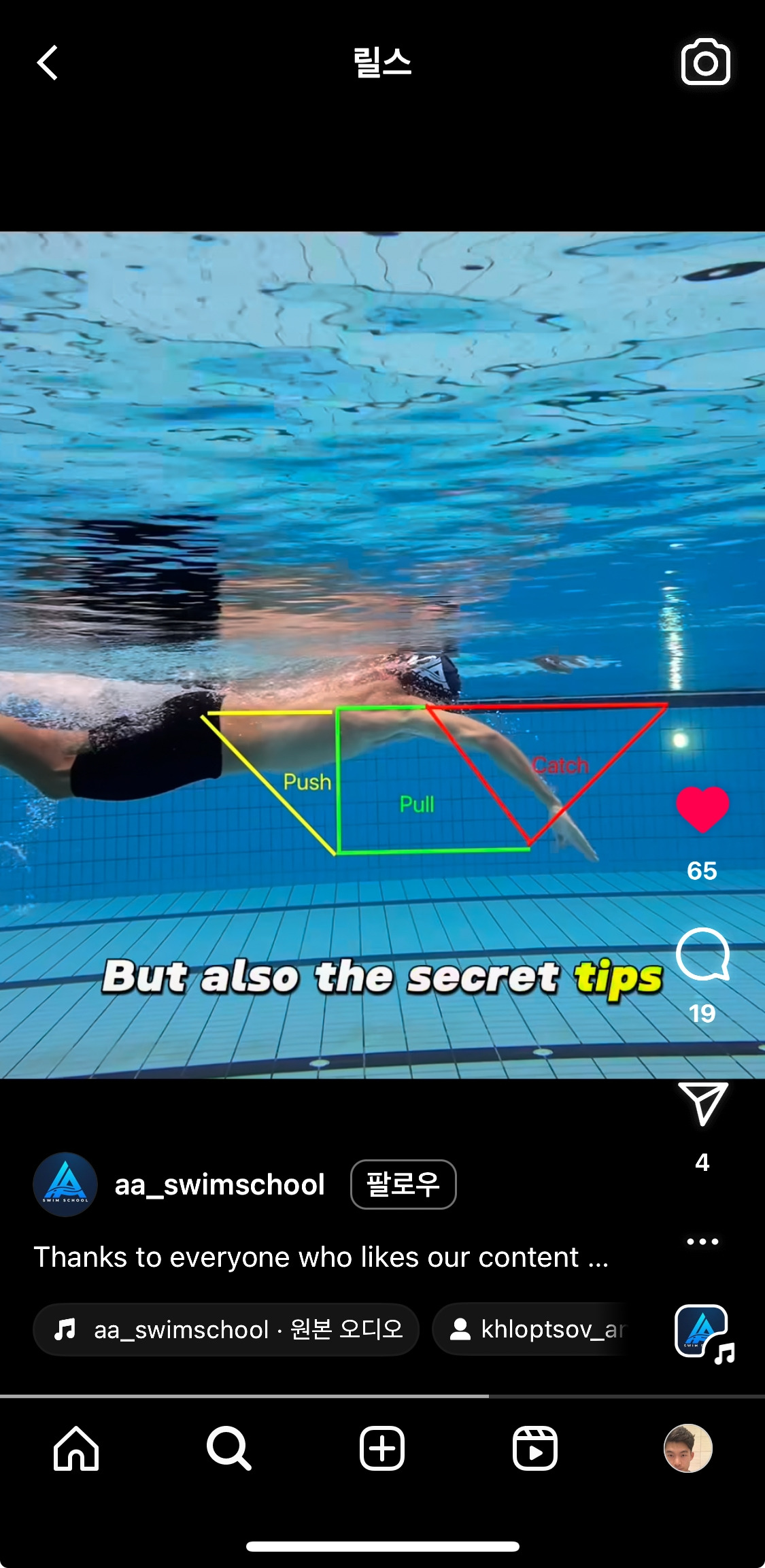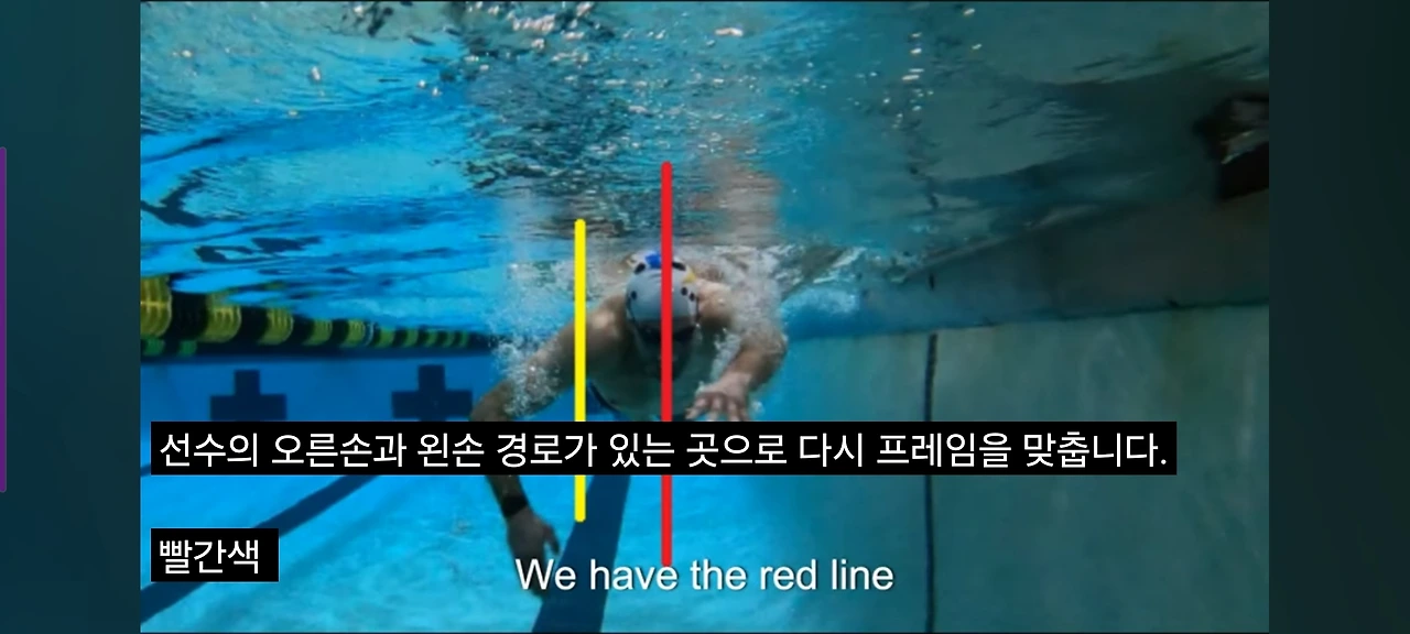 2번째 랩에서는 확실히 첫 번째 랩보다 체온이 더욱 오른 것이 느껴집니다. 코어에 힘이 빠집니다. 이럴 때일수록 허겁지겁 스트로크를 돌리는 것보다는 동작 하나하나 모양과 자세를 만들고 물이 빠져나가지 않도록 캐치풀푸시 감각에 더 집중해야 합니다. 리커버리 손이 내 어깨 앞으로 다시 입수할 때 물이 튀지 않고 물보라를 일으키지 않으며 최대한 부드럽게 들어가도록 합니다. 철퍼덕 물을 때리며 저항이 발생되는 것을 방지하는 이유도 있지만 무엇보다 물에 손을 넣을 때부터 캐치할 모양을 만들도록 끝까지 집중하기 위함입니다.
