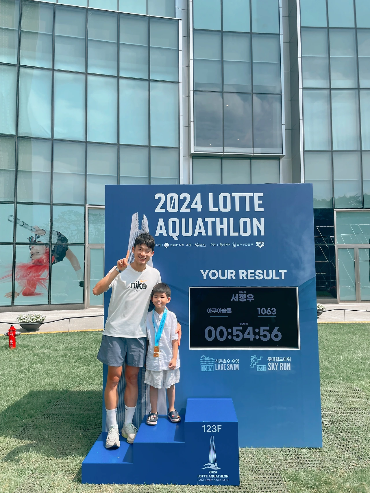 수영은 1,500미터. 석촌호수 동호 750미터 코스를 2회전 합니다. 거리는 정확했습니다. 오늘은 웻슈트가 금지된 노슈트 대회입니다. 무덥고 습한 7월의 날씨와 더불어 섭씨 27도 이상의 높은 수온으로 힘든 수영이 예상됩니다. 매년 그랬습니다. 이런 조건에서는 평소 실내 수영장에서 연습하던 1,500미터 기록보다 4~5분, 오픈워터 1,500미터 기록보다 3~4분은 손실된다고 미리 생각하셔야 합니다. 웻슈트의 부력도 없고, 실내 수영장에서처럼 반환 때마다 벽 차기를 하는 이점도 없습니다. 쉬지 않고 코어에 집중하고 스트로크를 돌려야 하기 때문에 높은 수온에서는 후반부에 더욱 지치게 됩니다. 동작의 최소화를 통한 심부 체온 관리를 위해 6비트, 4비트보다는 2비트 킥이 더욱 중요하다 생각합니다.