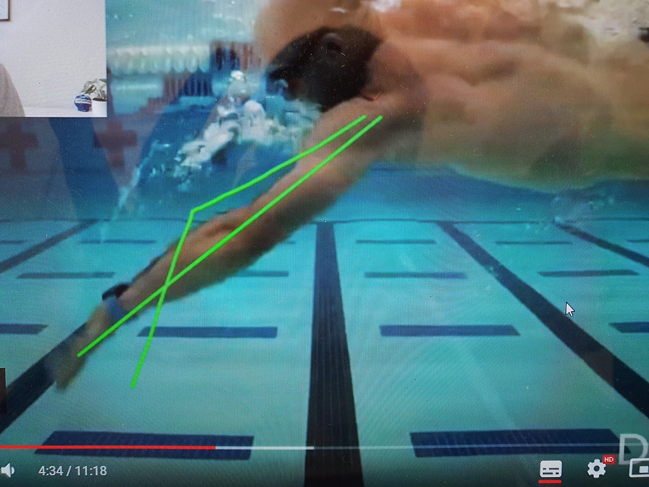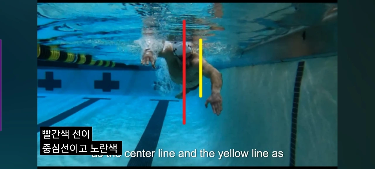 입수하는 손은 내 머리 앞이 아니라 내 어깨 앞으로 들어가야 합니다. 하지만 95% 이상의 동호인들이 머리 앞에 손을 넣습니다. 그게 곧게 직선으로 넣는 느낌이 들기 때문입니다. 느낌일 뿐입니다. 알파벳 Y 모양으로 손을 살짝 벌리듯 바깥 방향으로 들어가야 비로소 11자 직선으로 손이 들어가고 곧게 앞으로 나아갈 수 있습니다. 머리 앞에 손을 넣어버리면 하이 엘보로 물을 캐치할 수 있는 어깨 각도가 나오지 않습니다. 결국 팔을 돌려야 한다는 생각에만 급급하여 팔꿈치가 뒤로 빠지며 물을 제대로 잡지도 당기지도 밀어내지도 못합니다.