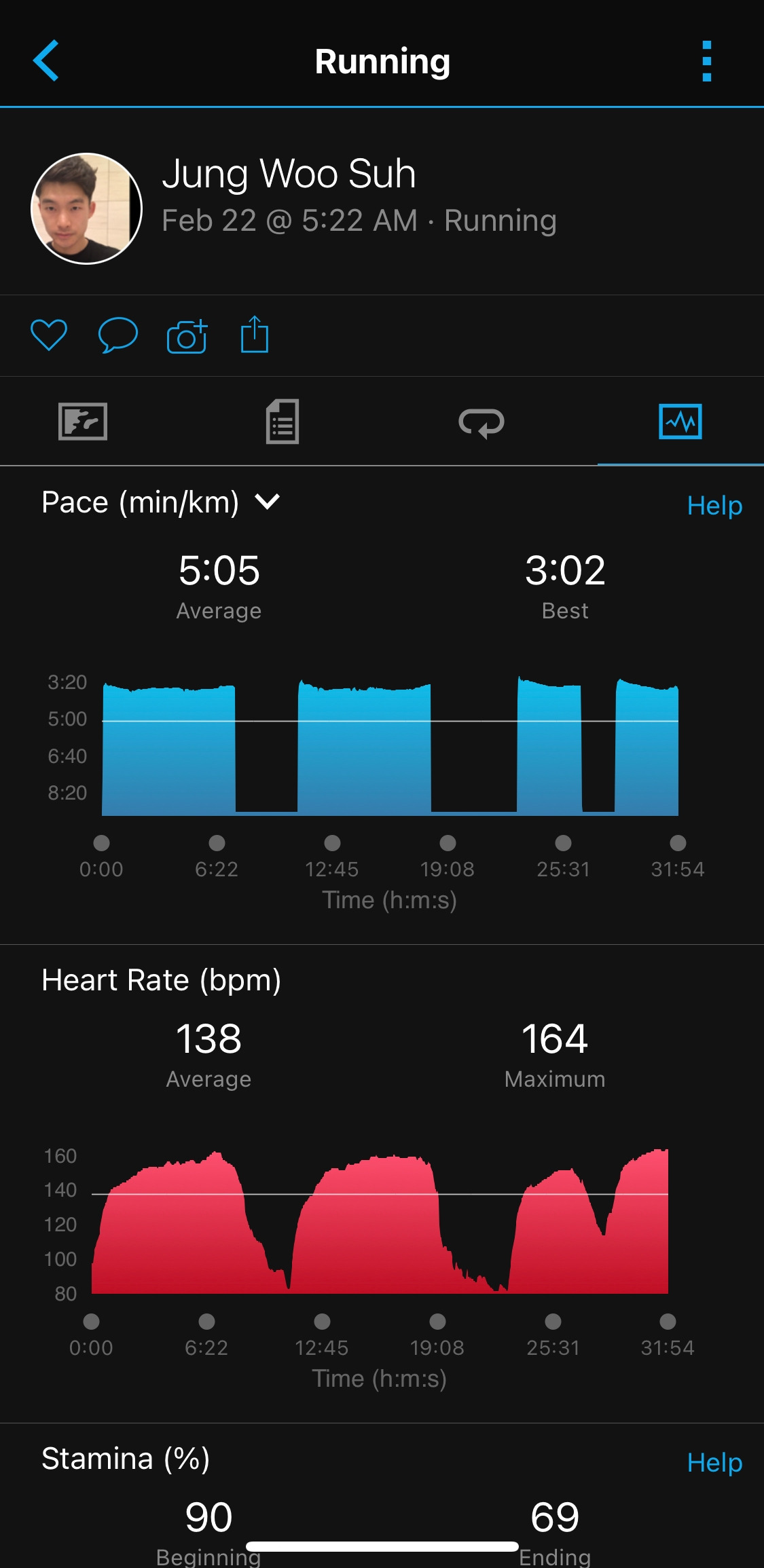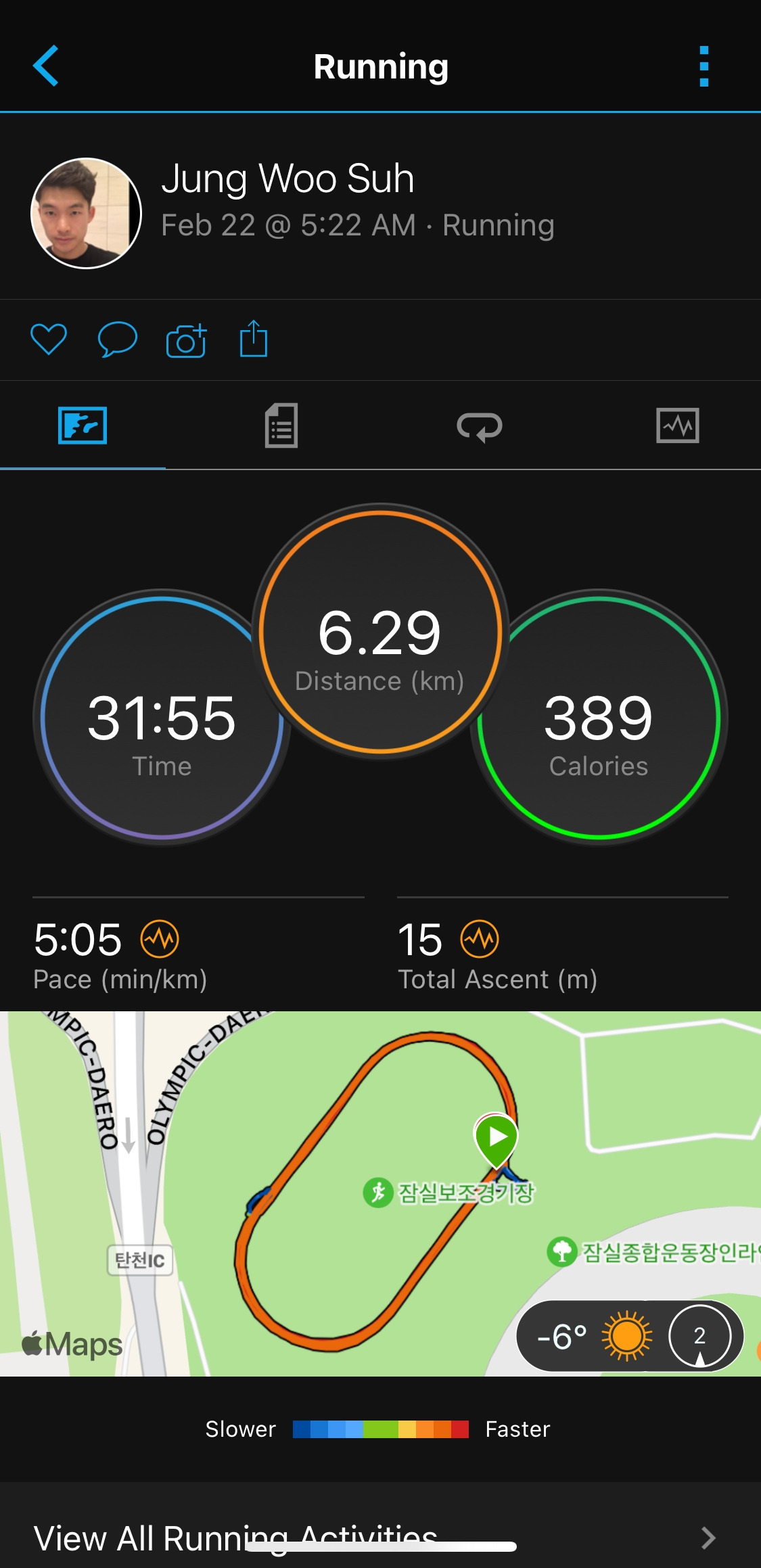 여행을 마치고 집으로 복귀 후 오늘 수요일은 2000m 2회, 1000m 2회 프로그램. 새벽 잠실보조경기장에 모여 훈련하였다. 짧은 거리의 달리기 훈련이라 페이스 밀리는 현상 없이 성공적으로 완료. 다만, 이런 체중으로는 장거리에서는 어려움이 있다. 덤벨 하나를 몸에 달고 뛰는 것과 마찬가지이기 때문이다. 대회 때까지 목표는 키 - 몸무게 => 110 이상. 사실 이것도 부족한 편이다