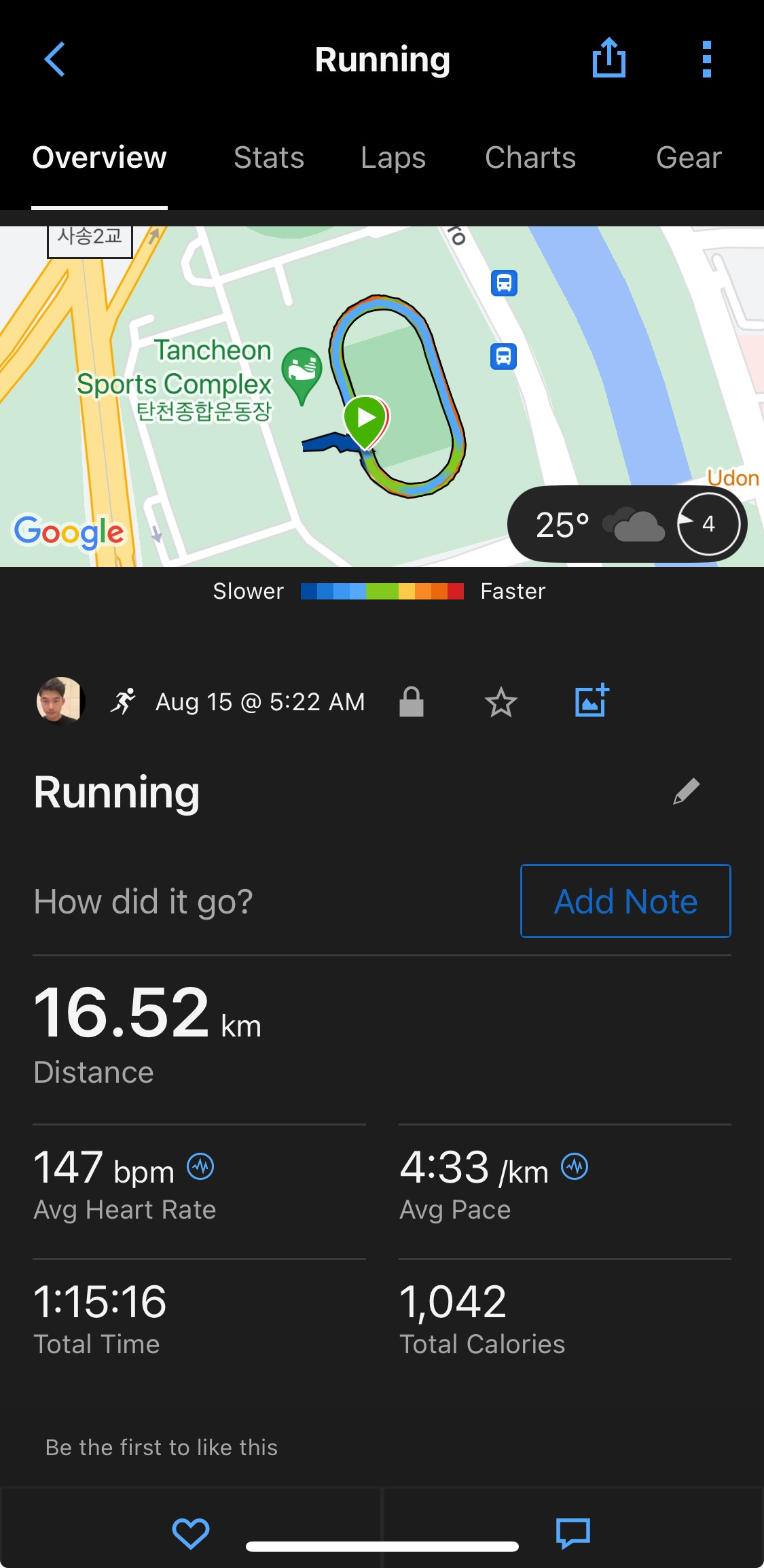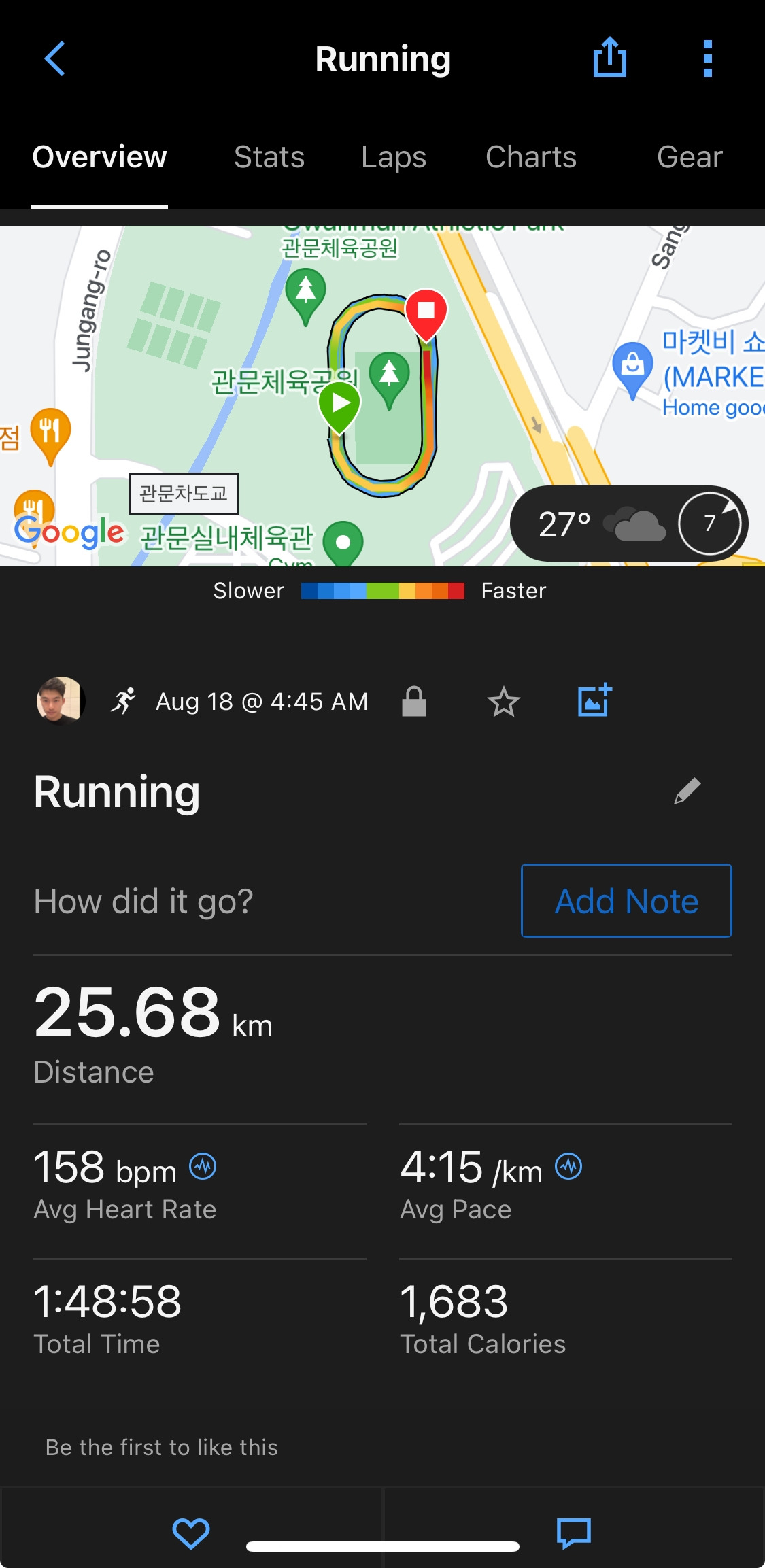 몇 번이나 포기하고 싶었지만 끝까지 달렸고 25,000m를 무사히 마쳐 다행입니다. 더운 날씨 속에서 시원한 에어컨 바람 아래 늦잠이나 자고 싶은 새벽이지만 오늘도 현관문을 나서고 습기로 가득한 밀도 높은 공기를 들이마시며 몸을 움직여 다행입니다. 내일 새벽에도 또 움직여야죠. 내일은 90분 달리기입니다. 저녁보다는 그나마 새벽이 더 좋을 것 같습니다.