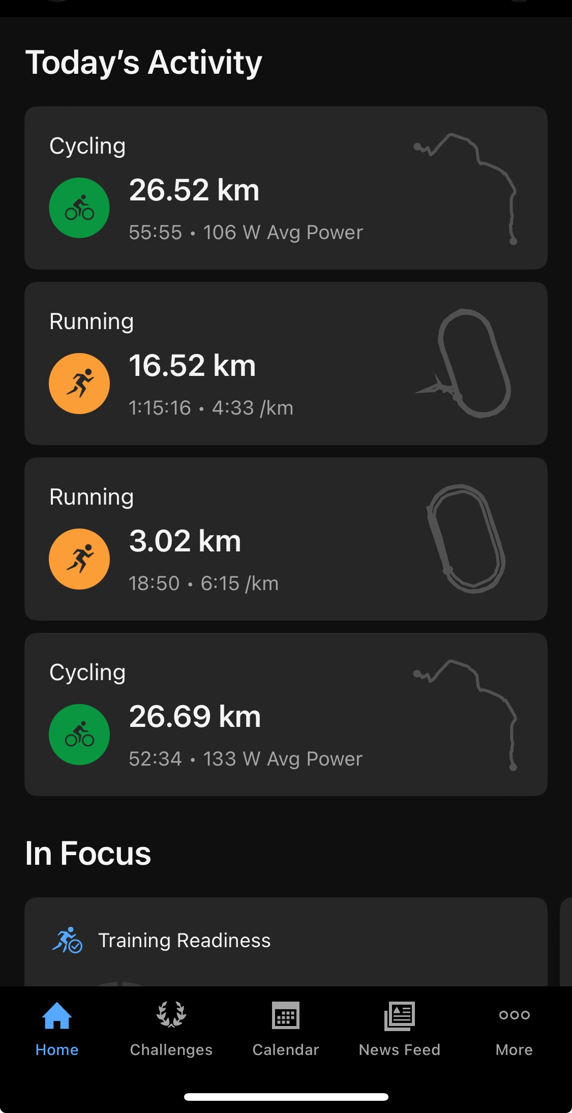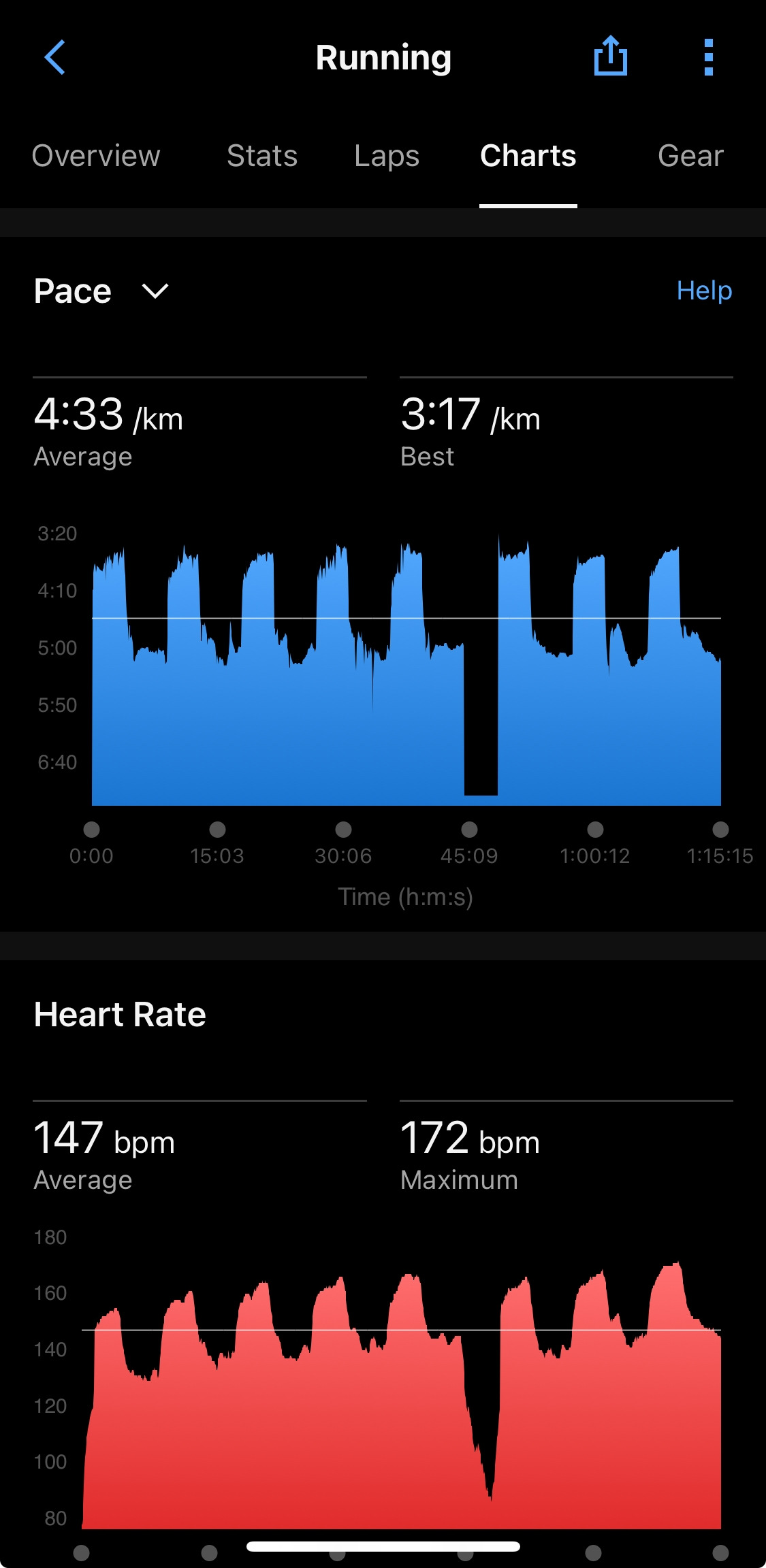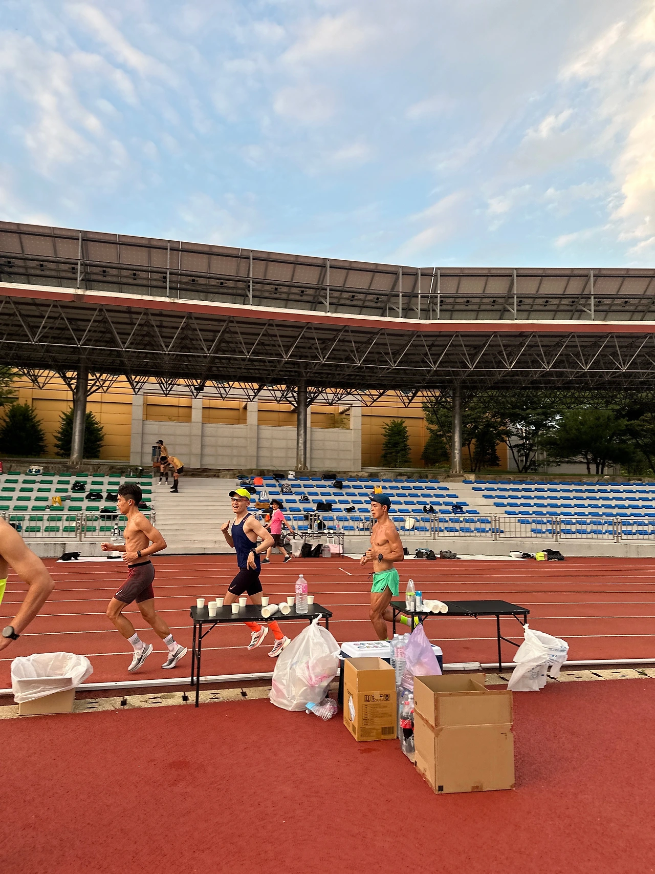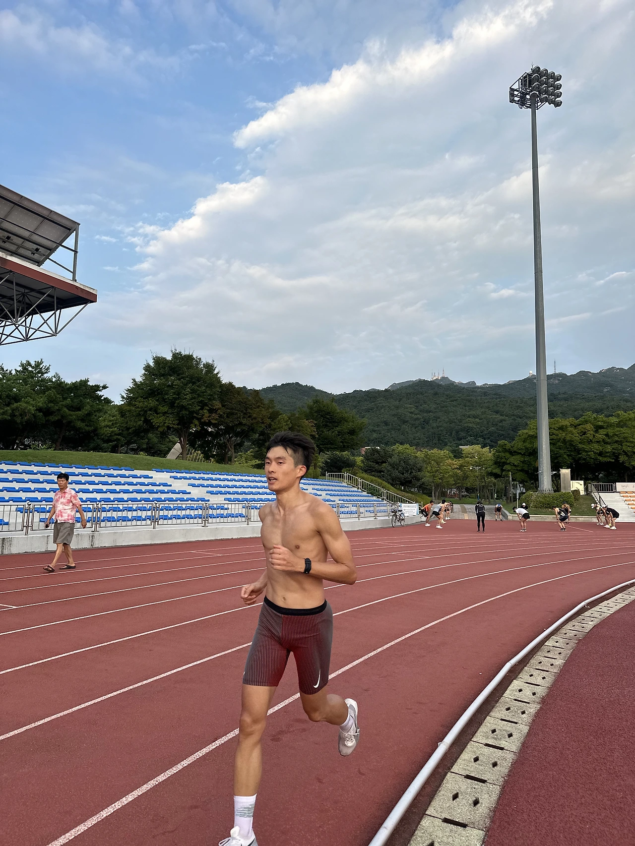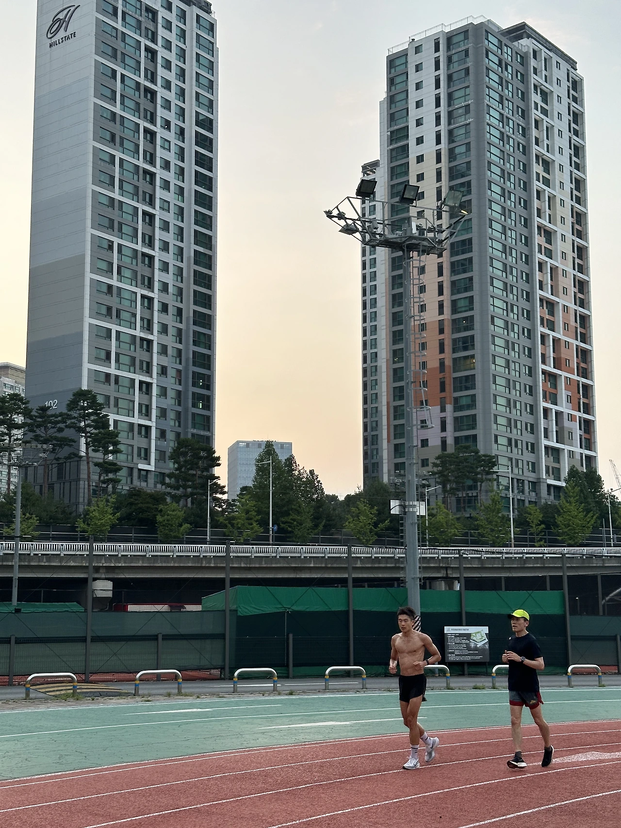 다음 날인 목요일은 광복절 휴일인 덕분에 평소와 다르게 수요일보다 조금 더 강한 강도의 포인트 훈련이 이어졌습니다. 1000m 3분 45초, 1000m 5분 10초 페이스로 휴식 없이 이어지도록 달리며 5세트 휴식 후 3세트, 총 8세트 16,000m를 강약 강약으로 달렸습니다. 역시 무척 더운 날씨였습니다. 달리기 운동 앞뒤로 각각 27km씩 사이클 라이딩으로 집과 트랙(탄천종합운동장) 왕복 이동을 했기 때문에 많은 땀을 흘렸습니다.