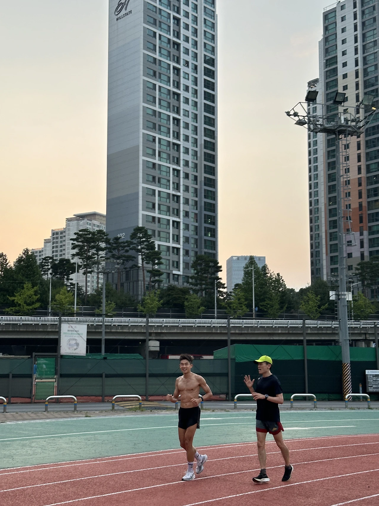 일요일 25,000m LSD를 앞두고 지난 수요일 포인트 훈련 때는 300m 질주와 100m 회복의 세트로 15회 진행했습니다. 300m는 61초, 100m 37초로 힘들지 않아 보였던 프로그램이지만 막상 찜통 같은 새벽 트랙에서 뛰어보니 덥고 습한 날씨 때문에 결코 쉽지 않았습니다.
