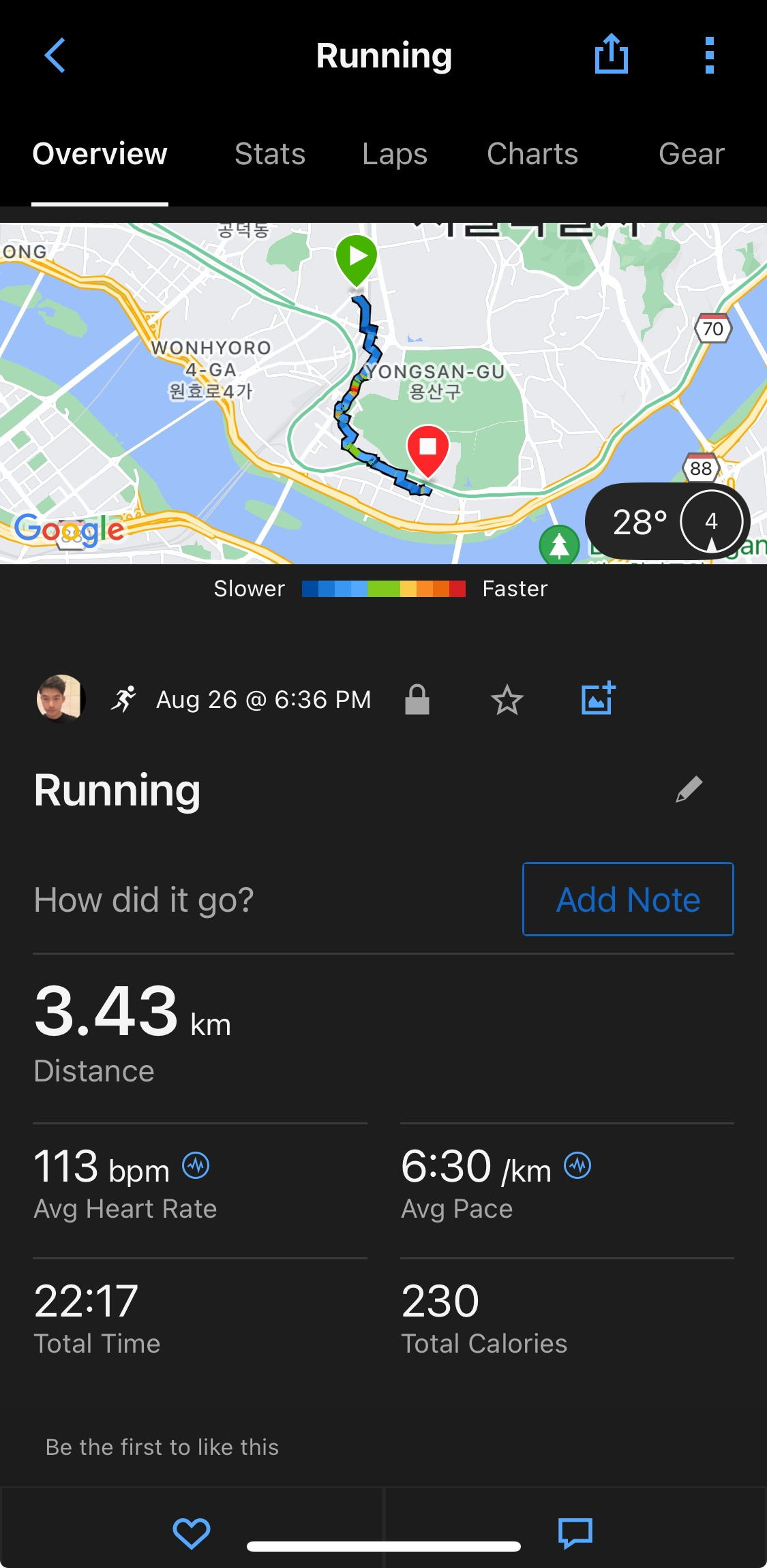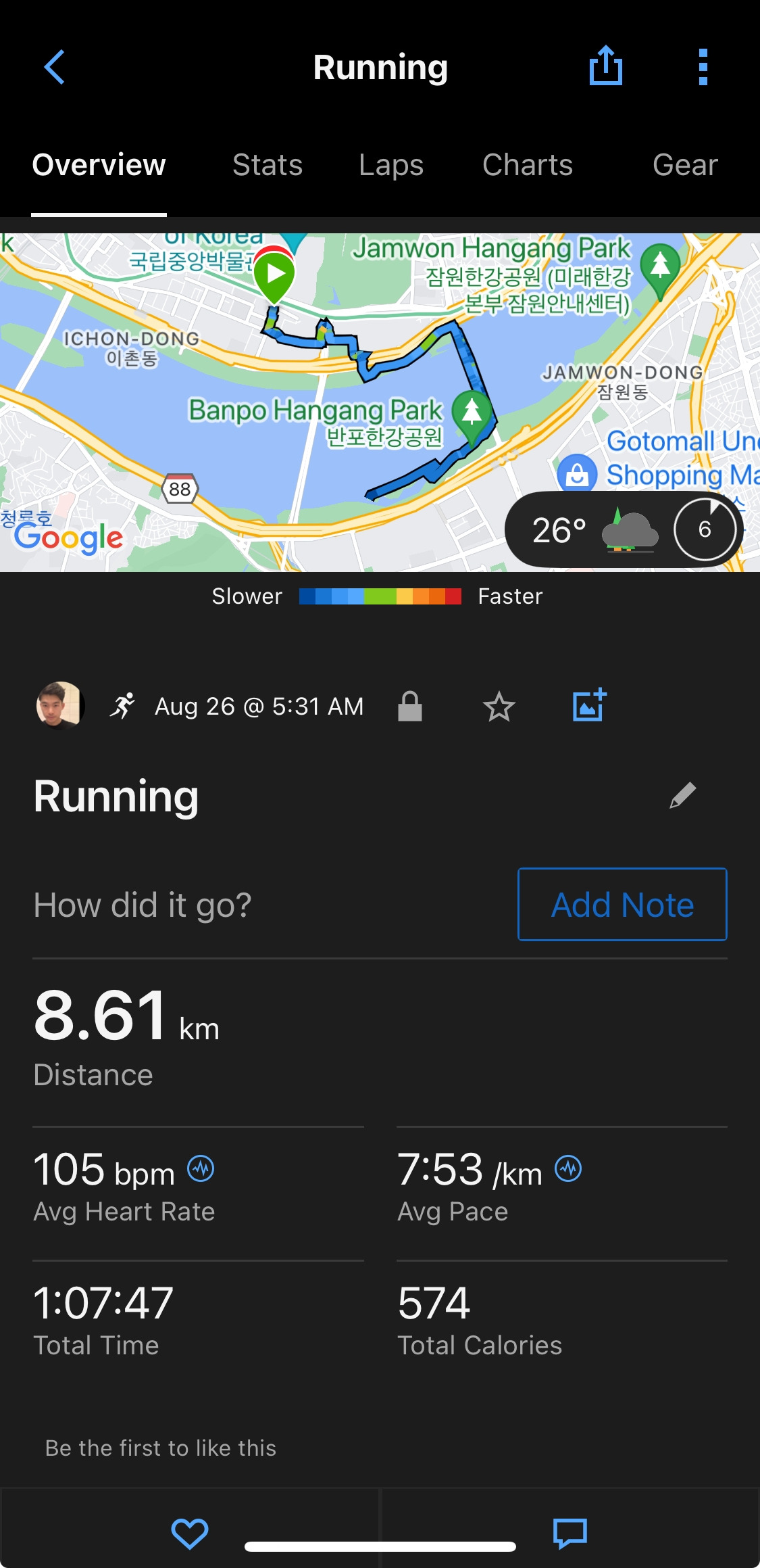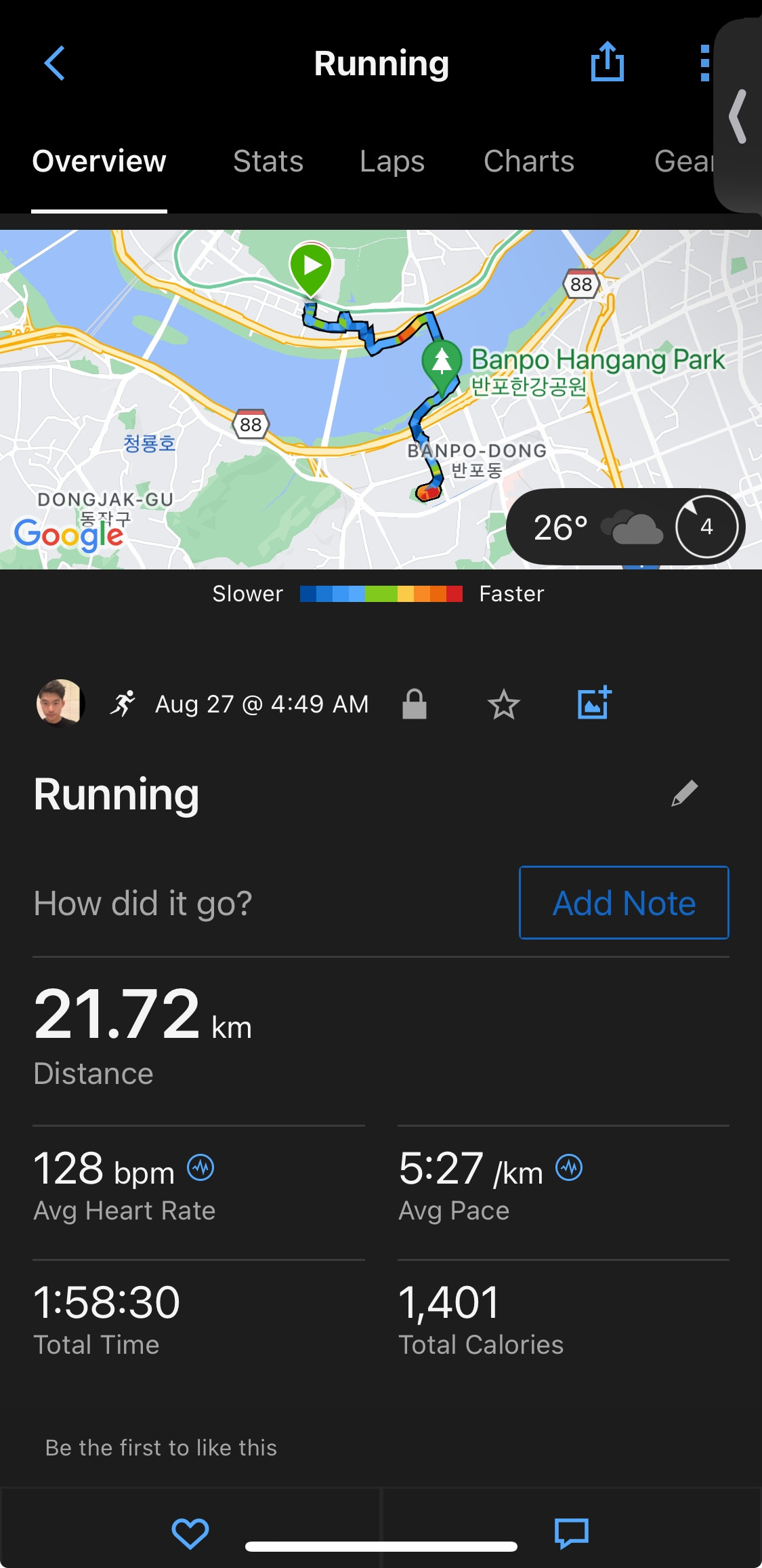 주말 운동 후 월요일과 오늘 화요일은 각각 리커버리런 그리고 90분 조깅을 했습니다. 프로그램 난이도에 대한 부담 없이 편안하게 할 수 있는 운동입니다. 리커버리런은 1km당 8분~10분 정도 거의 걷는 속도로 뛰는 것입니다. 90분 조깅은 천천히 느리게 시작해서 대회 목표 페이스보다 km당 +30초 정도(4분 20~25초/km)까지만 올립니다. 두 프로그램 모두 페이스 시간을 맞춰야 한다는 걱정 없이 언제든 나가서 뛸 수 있습니다. 제가 가장 좋아하는 훈련입니다.