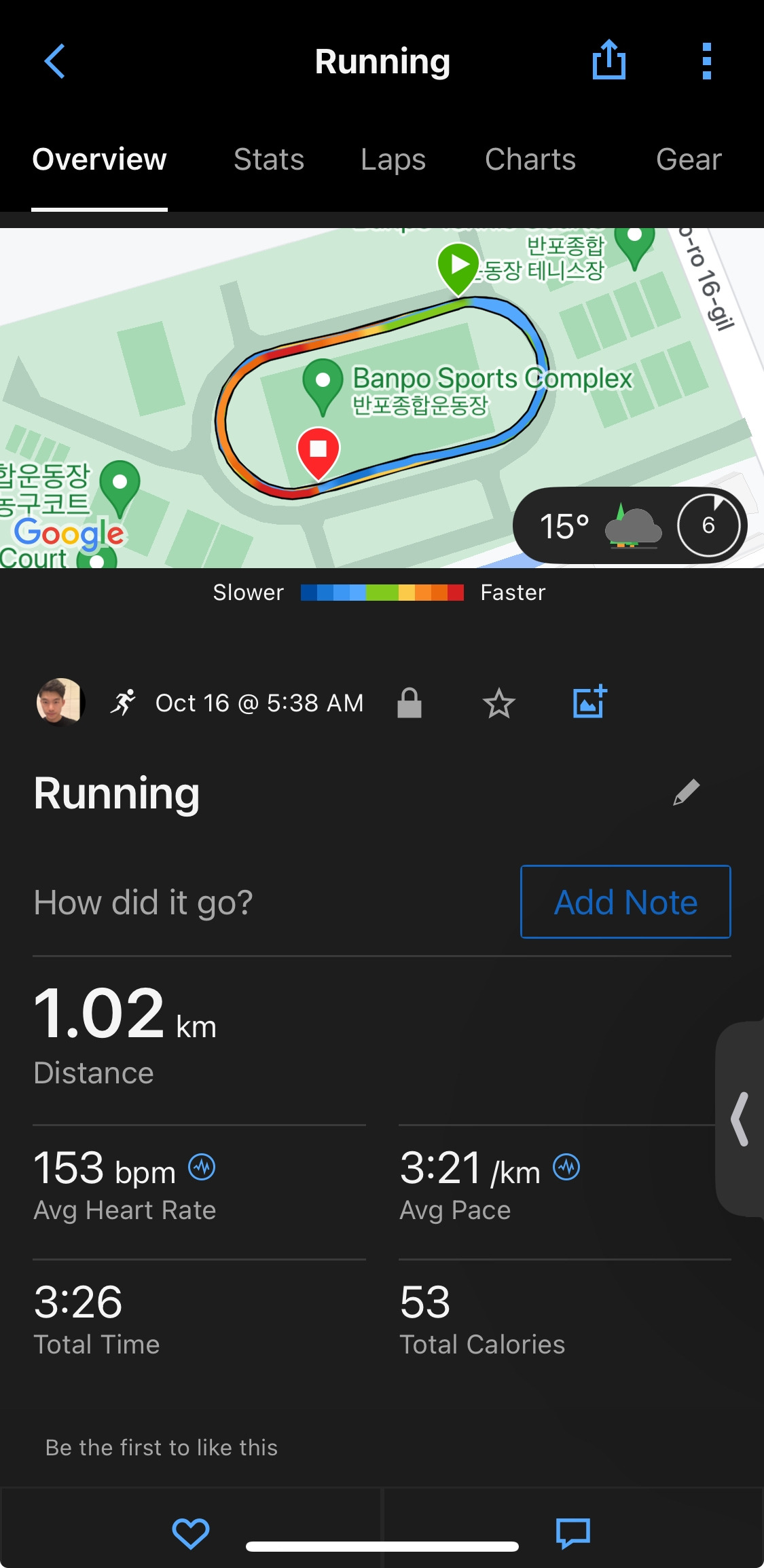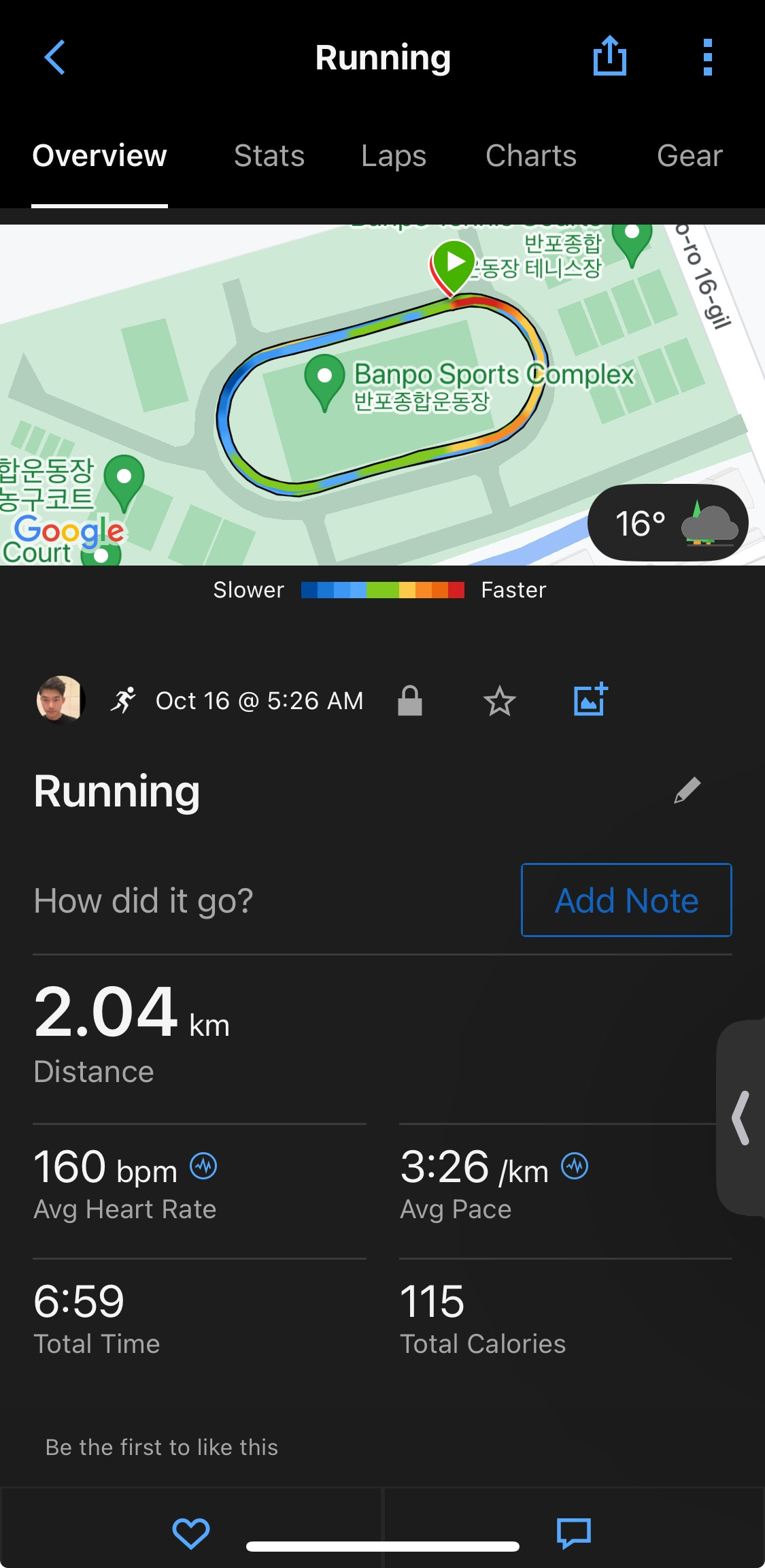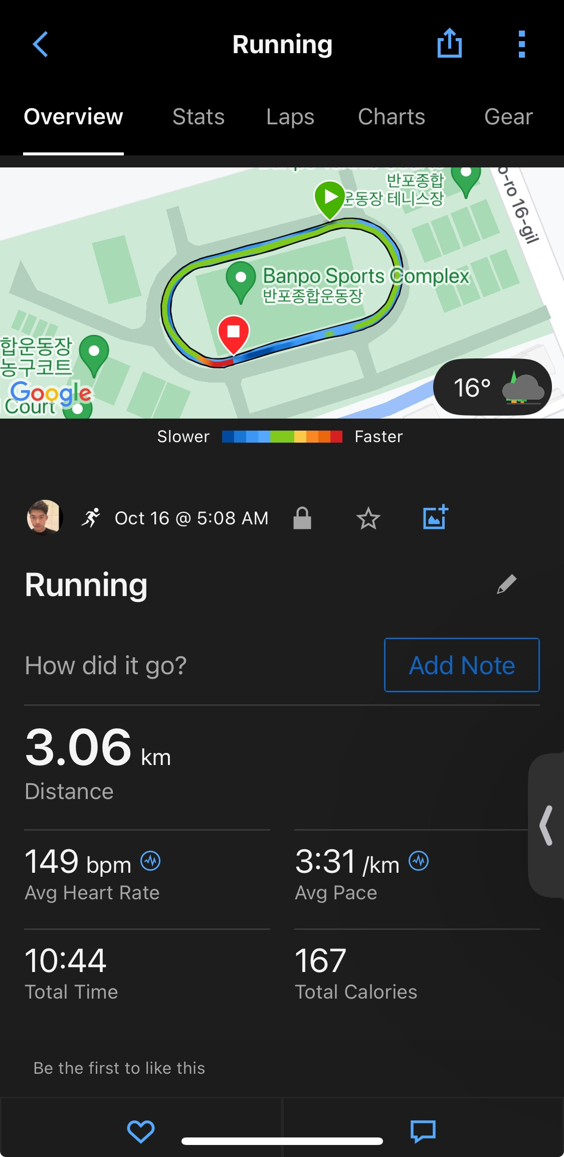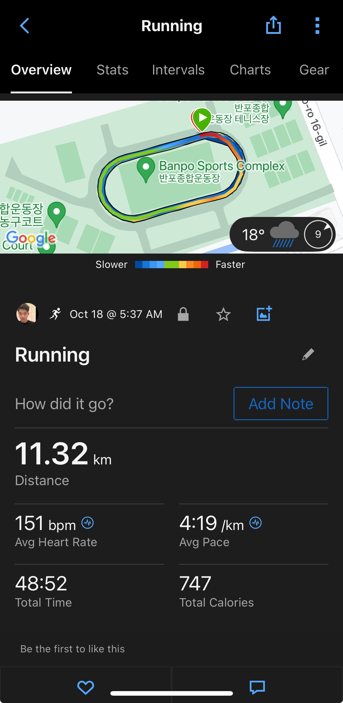 아이의 소원 덕분에 죽음에 대해 생각에 잠겨 있던 며칠이었지만, 사실은 새벽마다 크게 요동치는 심장 소리 덕분에 그 어느 때보다 ‘살아있음’을 느꼈던 새벽이 이어졌습니다. 수요일에는 3000m/2000m/1000m를 각각 3분 35초/km, 3분 30초/km, 3분 25초/km 페이스로 달렸고 목요일에는 조깅을 했습니다. 금요일에는 1200m(4분 35초/km) 400m(3분 15초/km) 7세트 달리를 하였는데, 모두 이전에는 이토록 심장이 뛰지도 않고 버겁지도 않은 수준이었지만 이번에는 무척 힘들었습니다. ‘살아있음’이 아주 좋은 뜻의 ‘살아있음’은 아니었습니다. 다시 꾸준히 몸을 아끼고 운동하여 다음에는 가뿐하게 할 수 있도록, 좋은 ‘살아있음’을 다시 느껴봐야겠습니다.