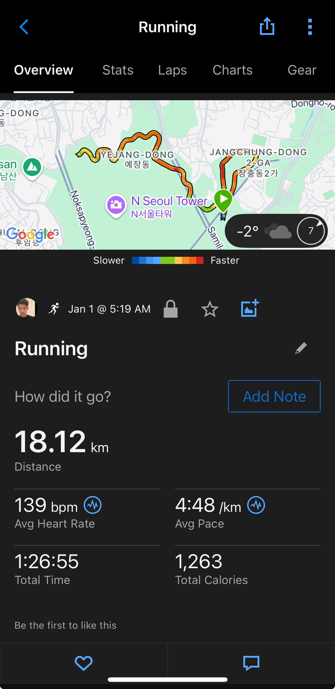1월 1일 새해 첫날. 함께 운동하는 팀오리지널파이어 분들과 남산 북측순환로 3회전을 달렸어요. 90분 프로그램이었는데 마지막 3랩에서 예상보다 빠르게 달려 86분으로 일찍 끝났습니다. 새해 첫날부터 잠 부족하면 힘들 것 같아 새벽 6시에 모일까 얘기하기도 했지만 다시 생각하니 아침 해돋이 구경할 사람들 많을 것 같아 기존 그대로 5시에 모여 운동했어요. 예상이 맞았어요. 6시에 시작했으면 산책로 사람 너무 많아 제대로 못 달릴 뻔했어요. 평소와 다르게 새벽 6시 이전부터 산책로에 꽤 많은 일반 옷차림(?) 사람들이 꽤 보이더니 6시 넘겨서는 정말 많은 사람들로 붐볐습니다.