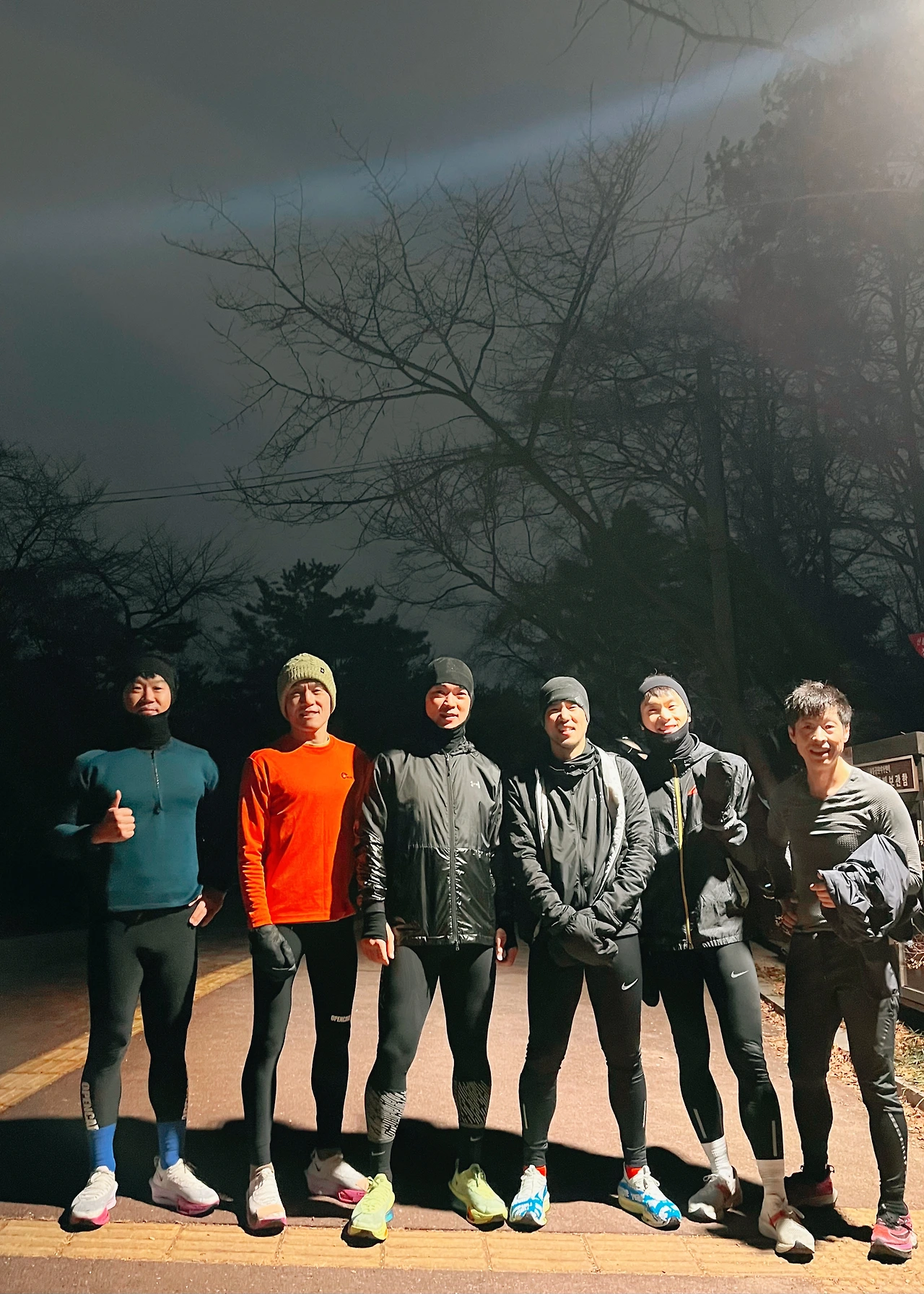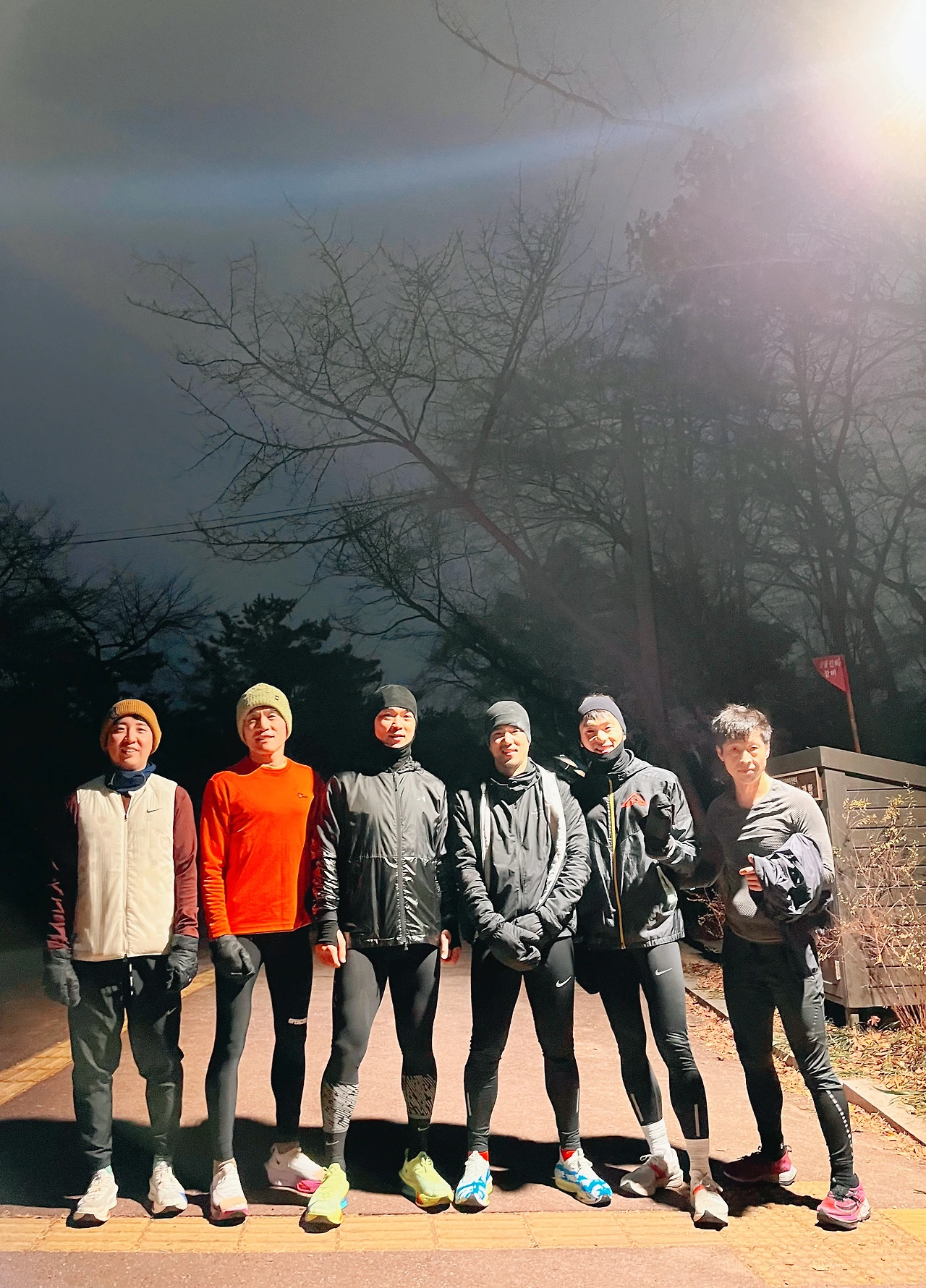 1회전 때에는 1킬로 5분 30초 페이스도 버거워서 '과연 오늘 빌드 업을 할 수 있을까?' 처음부터 끝까지 '이븐'하게 느린 조깅해야 할 것 같다고 생각했는데, 2회전, 3회전 거듭할 때마다 몸이 풀리고 숨도 덜 차올라 평소보다 오히려 더 빠르게 뛰면서 마쳤어요. 마지막 3회전에서는 남산 코스치고는 (제 기준) 상당히 빠르게 달렸습니다. 함께 운동한 분들과 기념사진.