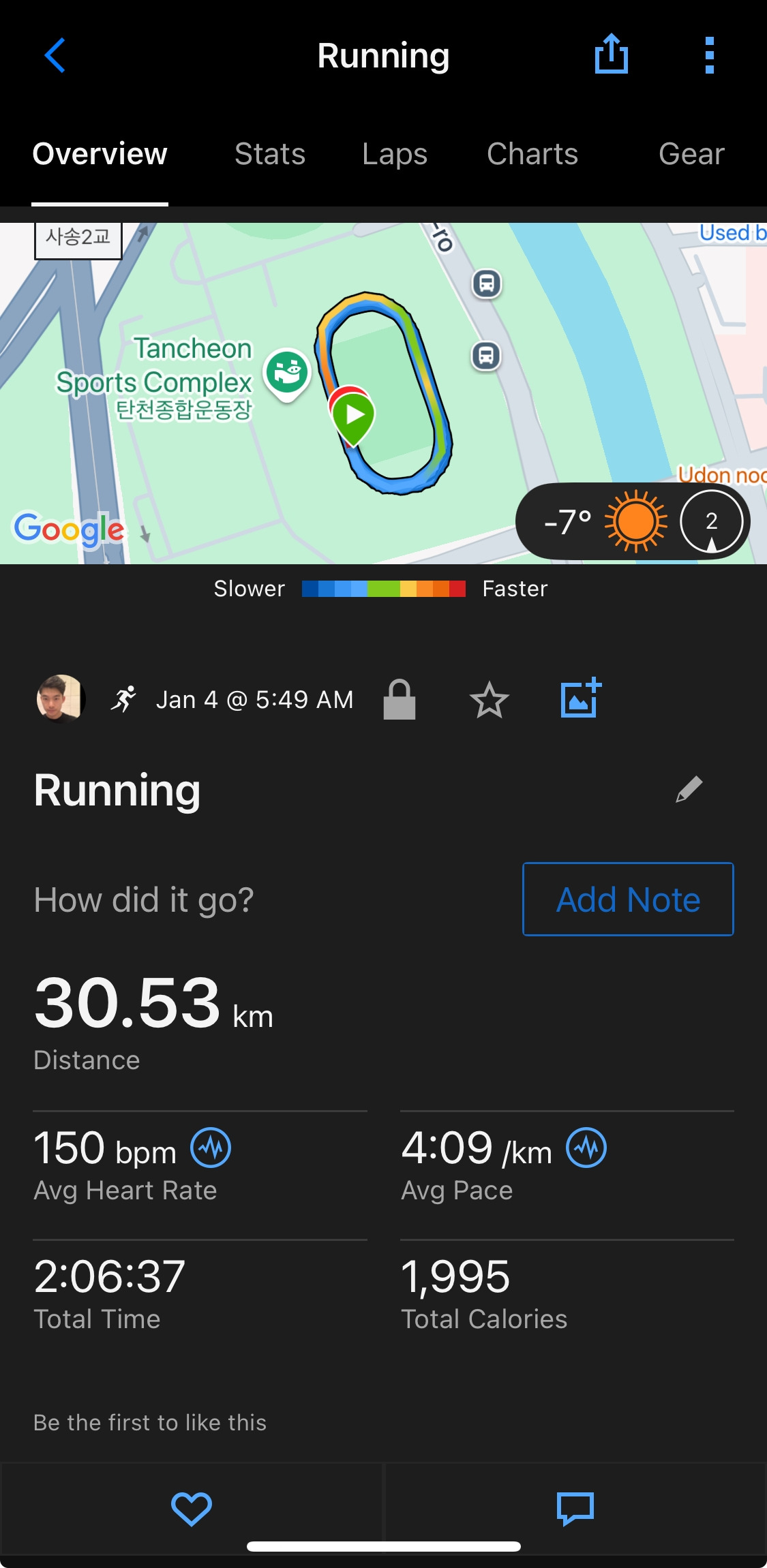 LSD 훈련 목적에 맞도록 조금씩 속도를 올렸고 마지막 바퀴 마지막 200미터 구간만 호연지기 마음과 경천동지 힘으로 질주하며 마무리했습니다. 바람이 불지 않아 크게 춥진 않았지만 그래도 영하 6~7도 기온으로 근육과 관절이 긴장한 상태이기 때문에 400미터 질주도 부담스러웠어요. 행여나 힘을 잘못 조절하면 앞으로 당기지 못하고 뒤로 밀면서 달릴 수 있고, 그러면 아킬레스나 뒤쪽 넓적다리 햄스트링에 부상을 입을 수 있기 때문입니다. 200미터만 센 척 강한 척 빠른 척하며 끝냈습니다.