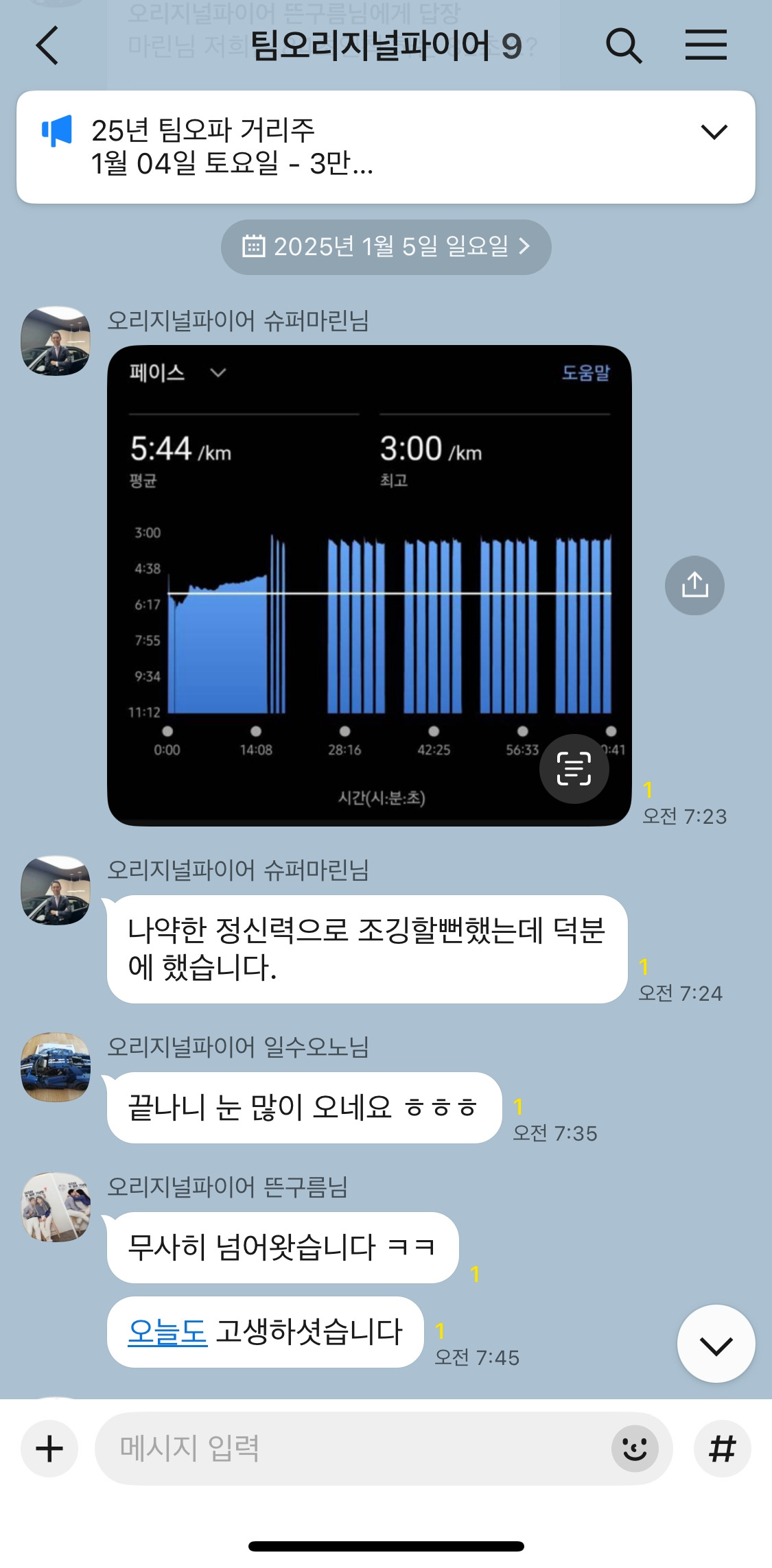 여러분, 패딩이나 방풍 바람막이 같은 건 웜업이나 쿨다운 할 때나 착용하셔야 해요. 메인 포인트 훈련할 때는 입는 것 아닙니다. 영하 10도까지 상의는 긴팔 티 1장만 입고 뛰면 충분합니다. 그 정도까지 체온이 안 올라온다면 준비운동이 부족하거나 메인 훈련 강도가 너무 약하거나 아니면 열정과 의지가 없는 겁니다. 공기 안 통하는 방풍 바람막이 같은 옷은 메인 훈련할 때 입으시면 안 돼요. 바람막이 저분 요즘 말씀만 하시면 조깅이나 할 뻔했는데 마치면 뛰길 잘했다고 하시는데요. 가만히 보면 이제 귀엽기도 하십니다. 맨 정신에는 귀여워 보이지 않고 보는 사람도 살짝 맛이 가야 저분이 귀여워 보이십니다. 어떤 분인지는 비밀입니다.