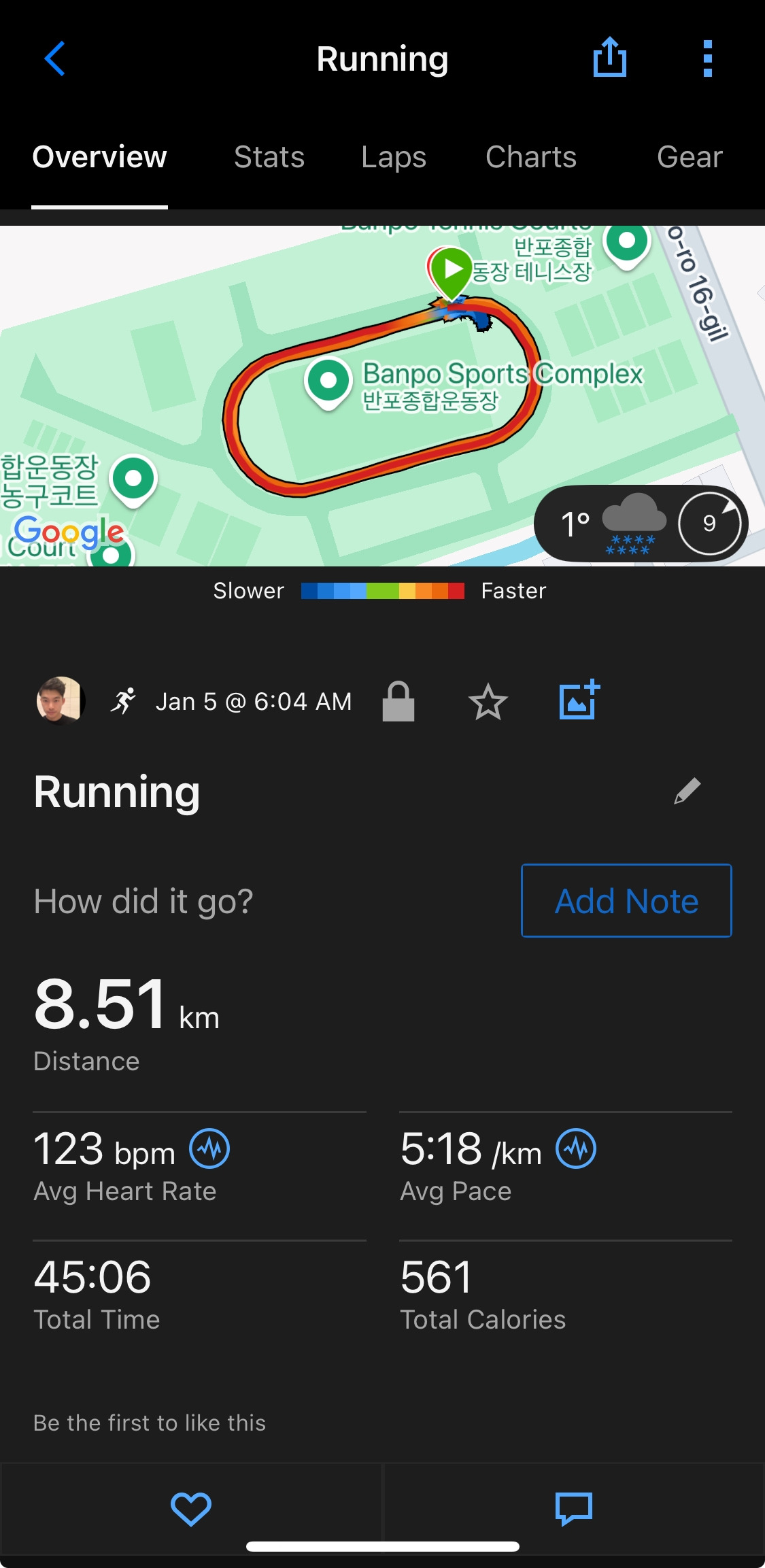 오늘도 등 허리는 쭉 펼쳐서 바짝 세우고 무게중심을 위로 올리는 느낌을 유지하며 달렸습니다. 속도를 올릴 때에는 뒤로 밀며 발을 차거나 땅을 찍고 발목을 뒤로 젖히며 속도를 내는 것이 아니라 무게중심을 올리면 자연스럽게 보속(케이던스)이 오르는 느낌으로 속도를 올려야 합니다. 발목 각도는 직각을 유지하며 발목 부상을 방지하고 착지 때 내 몸의 탄성을 유지해 줘야 합니다. 코어 근육 강화와 고관절 활성화하는 지상 동작 반복 연습을 꾸준히 해야겠습니다.