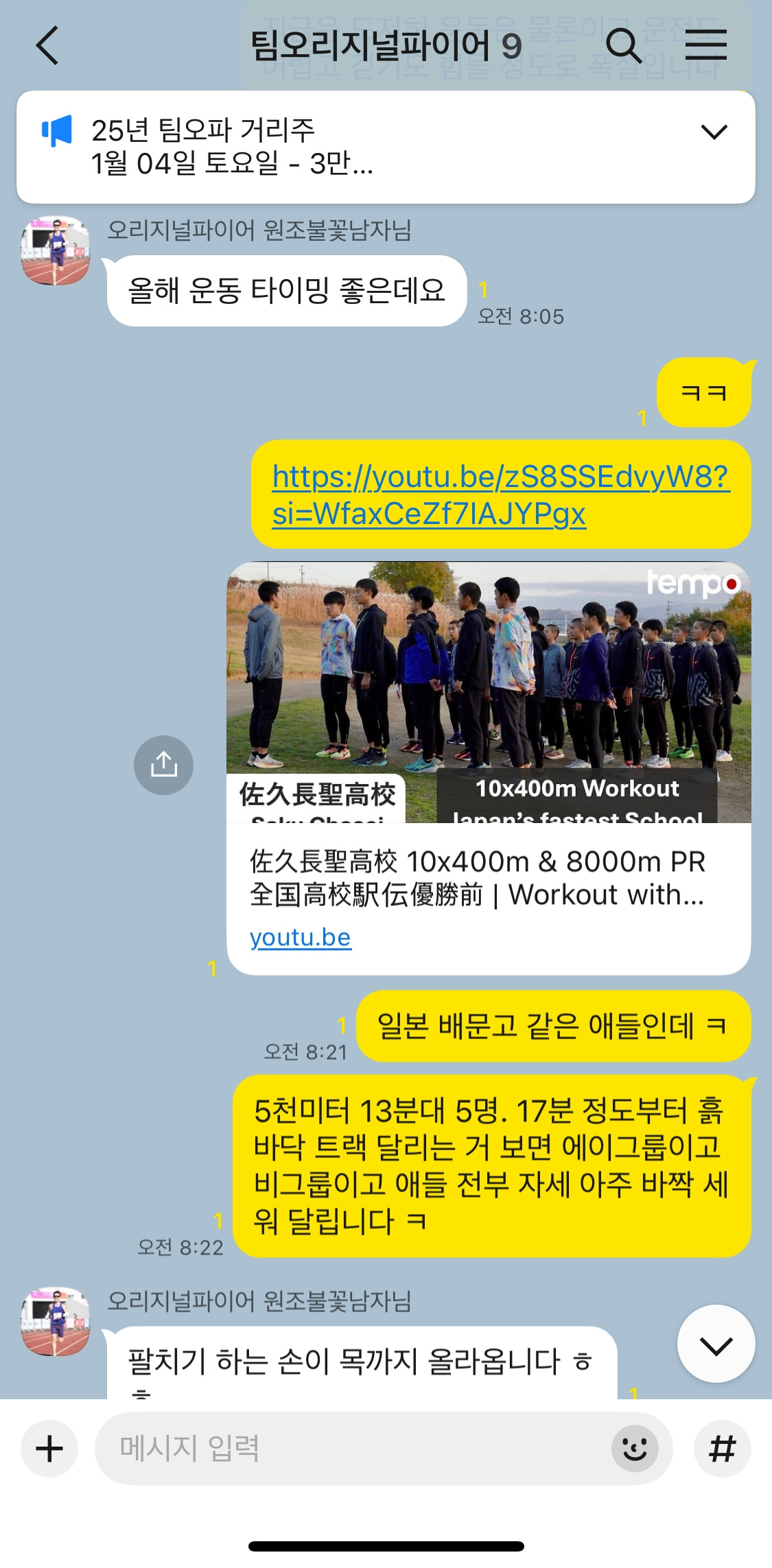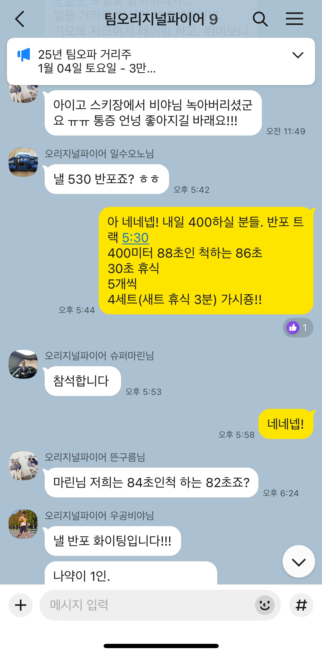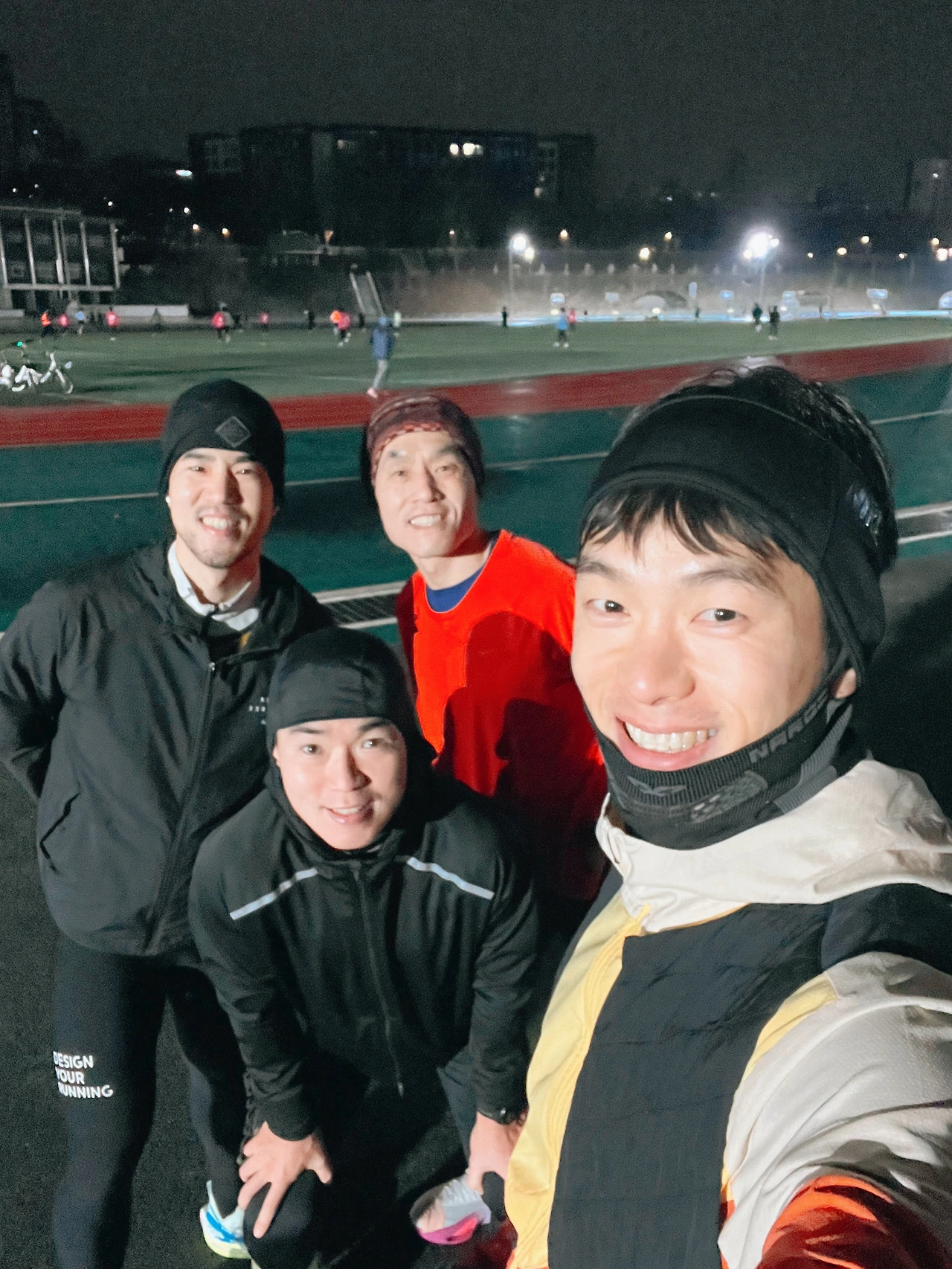 어제는 느린 페이스로 30000미터 훈련을 했기 때문에 오늘은 빠른 속도 감각을 만회할 겸 400미터 반복 프로그램으로 달렸어요. 2명은 400미터 88초인 척하는 86초, 30초 제자리 휴식, 5회씩 1세트, 세트 휴식 3분, 총 4세트로 400미터 20회입니다. 나머지 2명은 400미터 84초인 척하는 82초입니다. 오늘 어떤 분들이 함께 모여 달렸는지 비밀입니다.