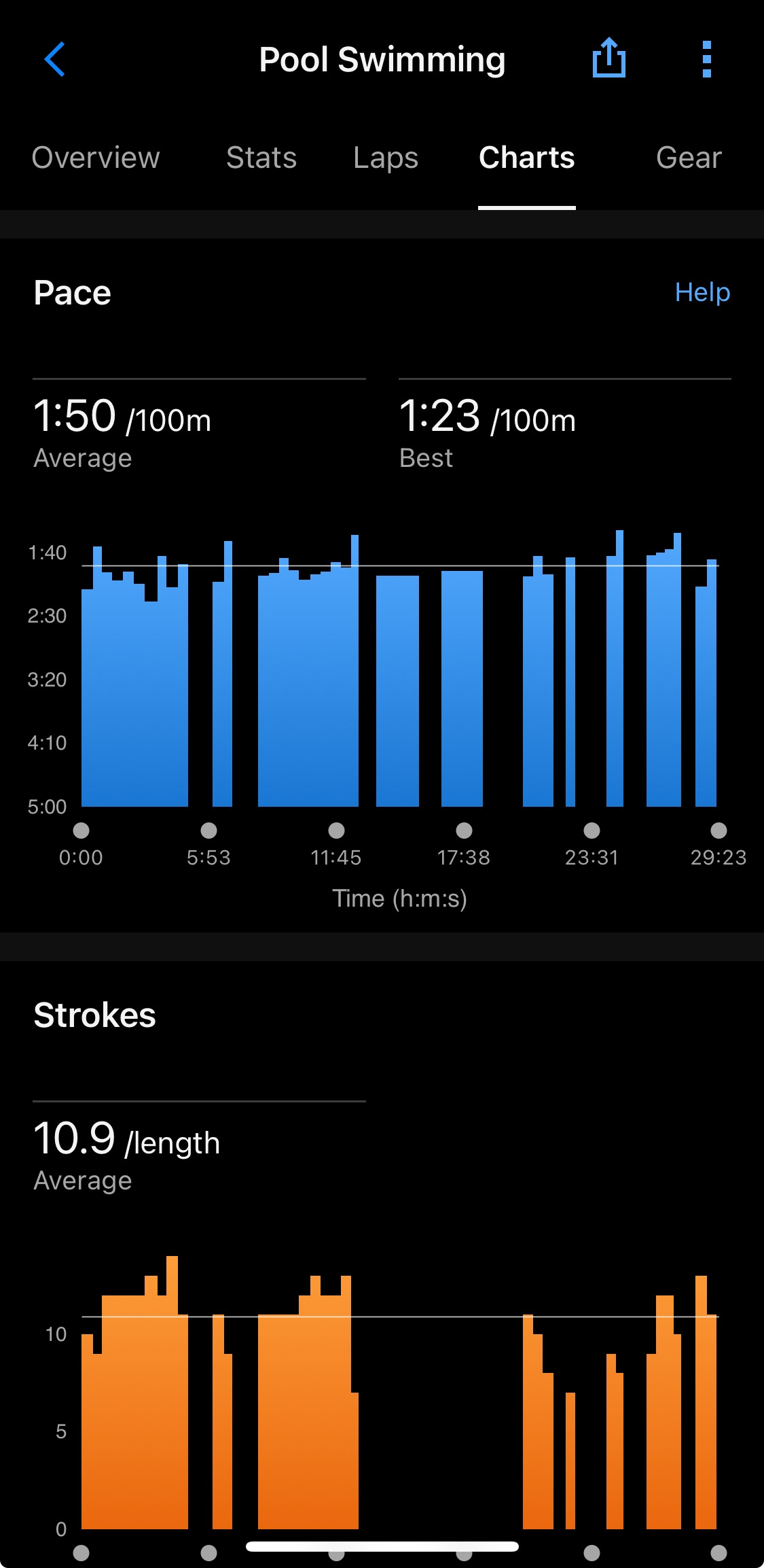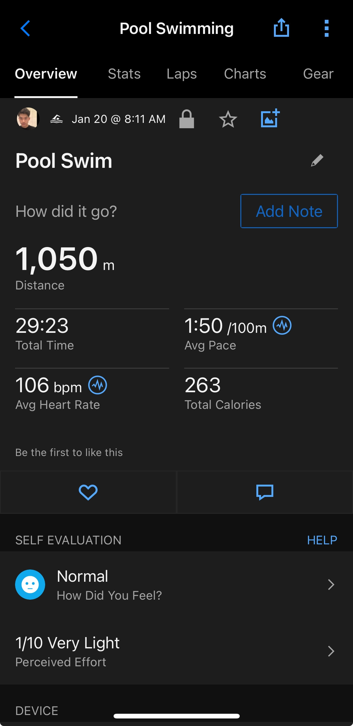 오늘 아침 자유수영은 20분, 1050m 했습니다.