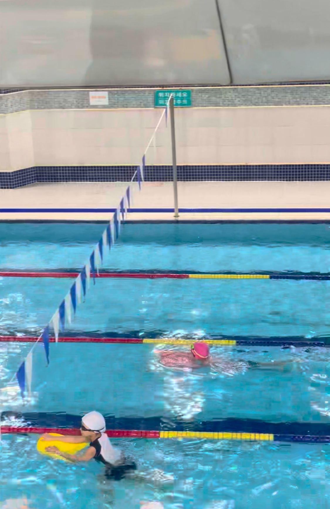이전 (찔끔) 수영 연습을 할 때에는 아들이 앞장서고 제가 뒤따라가며 어떻게 수영하는지 지켜봤는데요. 5미터~10미터만 가다 서다 반복하곤 했어요. 이번에는 바꿔서 제가 먼저 가면서 아들에게 따라와 보라 했어요. 킥판 잡고 발차기였는데, 놀랍게도 아들은 한 번도 쉬지 않고 25m 끝까지 잘 따라왔습니다. 한 번 더 조금 더 빠른 속도로 킥판 잡고 발차기를 했는데 이번에도 쉬지 않고 잘 쫓아왔어요. 반대편에 도착하여 거친 숨을 내뱉는 아들이 대견하고 기특했습니다.