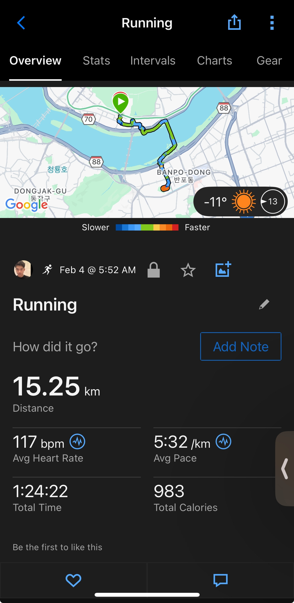새벽 집에서 출발하여 한강공원을 지나 반포 트랙까지 천천히 느리게 달리고, 트랙 도착 후 25분 동안 1km 페이스 4분 30초에서 3분 50초까지 변화시키며 빠른 조깅으로 뛰었어요. 5시 50분 넘어 늦은 시각 출발하여 1000미터 세트는 하지 않았습니다. 내일도 원래는 2000미터 인터벌 세트 프로그램이지만 날씨와 제 몸 상태를 살펴 오늘과 비슷한 프로그램으로 할 계획입니다. 추울 때에는 페이스를 서서히 올리는 장거리 또는 장시간 조깅 훈련이 도움 됩니다.