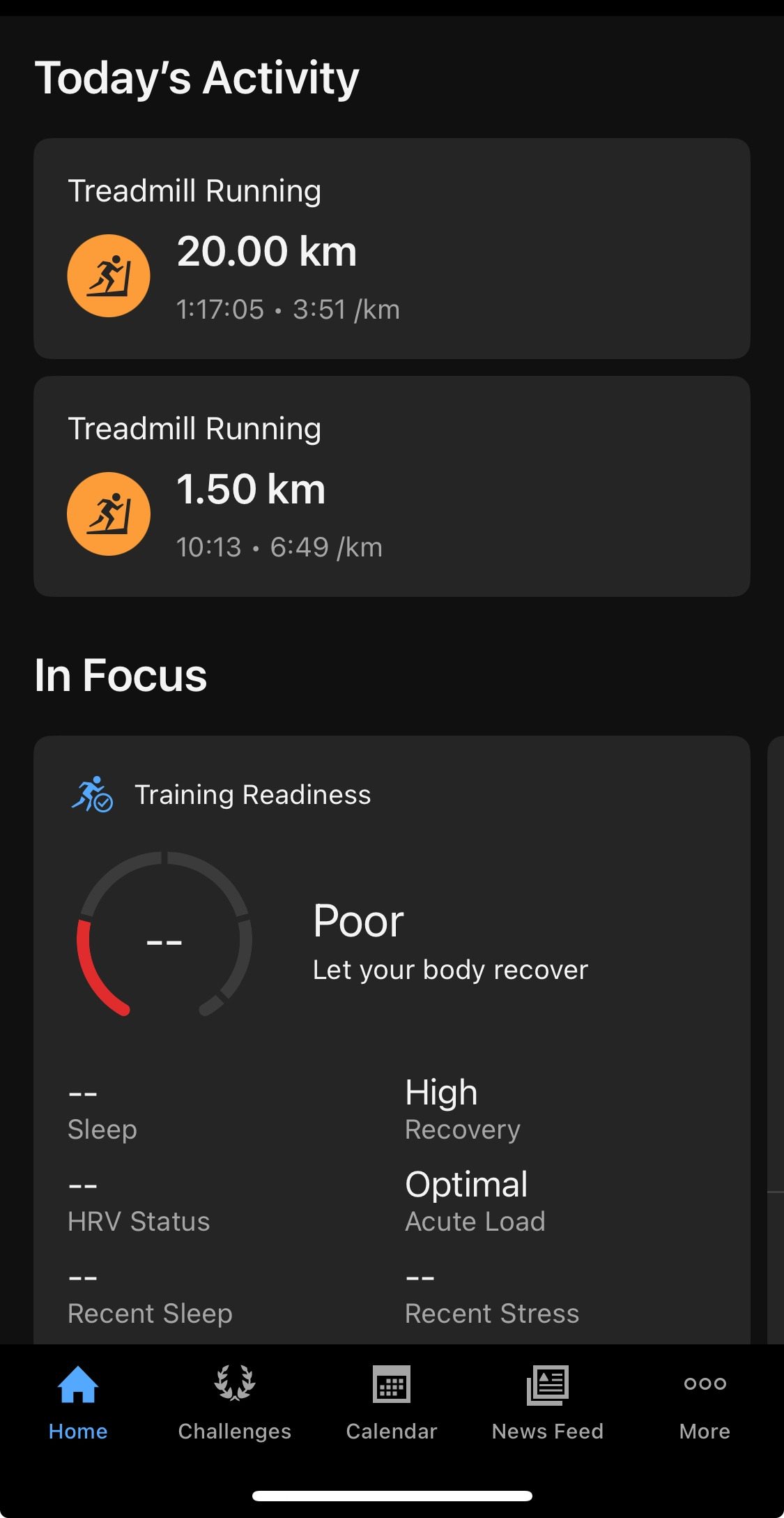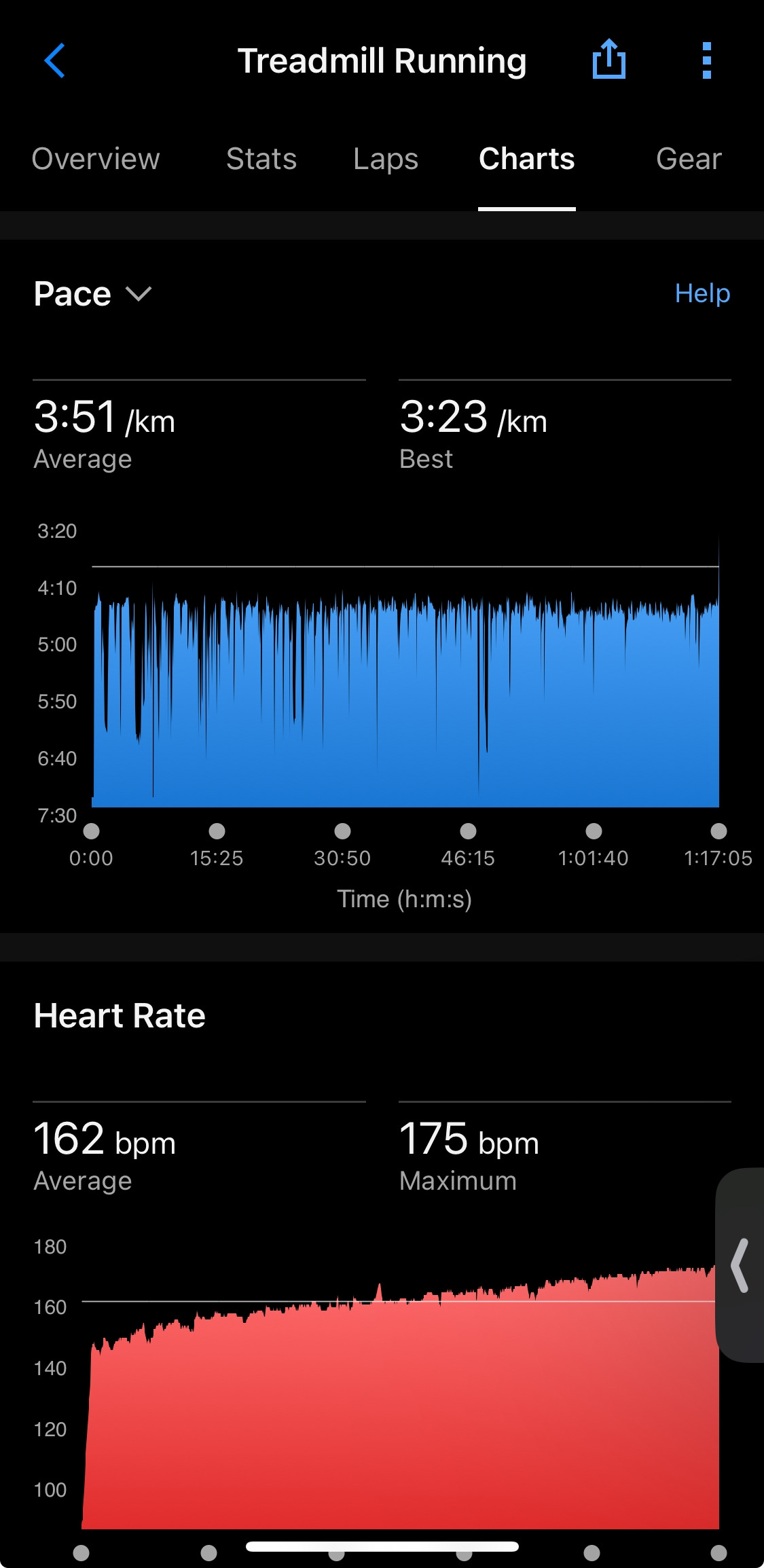 처음 3km는 15.1km/h(1킬로 3분 59초 페이스), 3km~10km 구간은 15.3km/h(1킬로 3분 55초 페이스), 10km~16km 구간 15.6km/h(3분 50초 페이스), 16km 이후 16.1km/h(3분 45초 페이스)에서 점점 빠르게 올리며 마무리했습니다. 트레드밀을 거의 안 뛰다 보니 가민 포러너 965 워치의 트레드밀 모드 캘리브레이션 페이스 오차가 너무 심하네요. 예전에는 이 정도는 아니었는데 아마 최근 제가 상체 자세 고정과 유지에 집중하며 팔 치기 동작 궤적을 많이 줄였기 때문에 가민 워치 자이로센서가 인식을 못 한 것 같습니다. 페이스를 많이 올려도 워치가 1킬로 5분 대 초반에서 4분 40초 대로 인식하는 걸 보면서 달릴 때 상체 자세가 꽤 안정적으로 개선된 것 같아 기분 좋았습니다. 트레드밀 맞은편 유리에 비친 제 모습을 보니 아직도 더 고정시킬 부위들이 눈에 띄었습니다. 종종 트레드밀에서 달리며 자세를 체크하면 더 좋겠다는 생각을 했습니다. 기회가 자주 있을 것 같지는 않습니다.