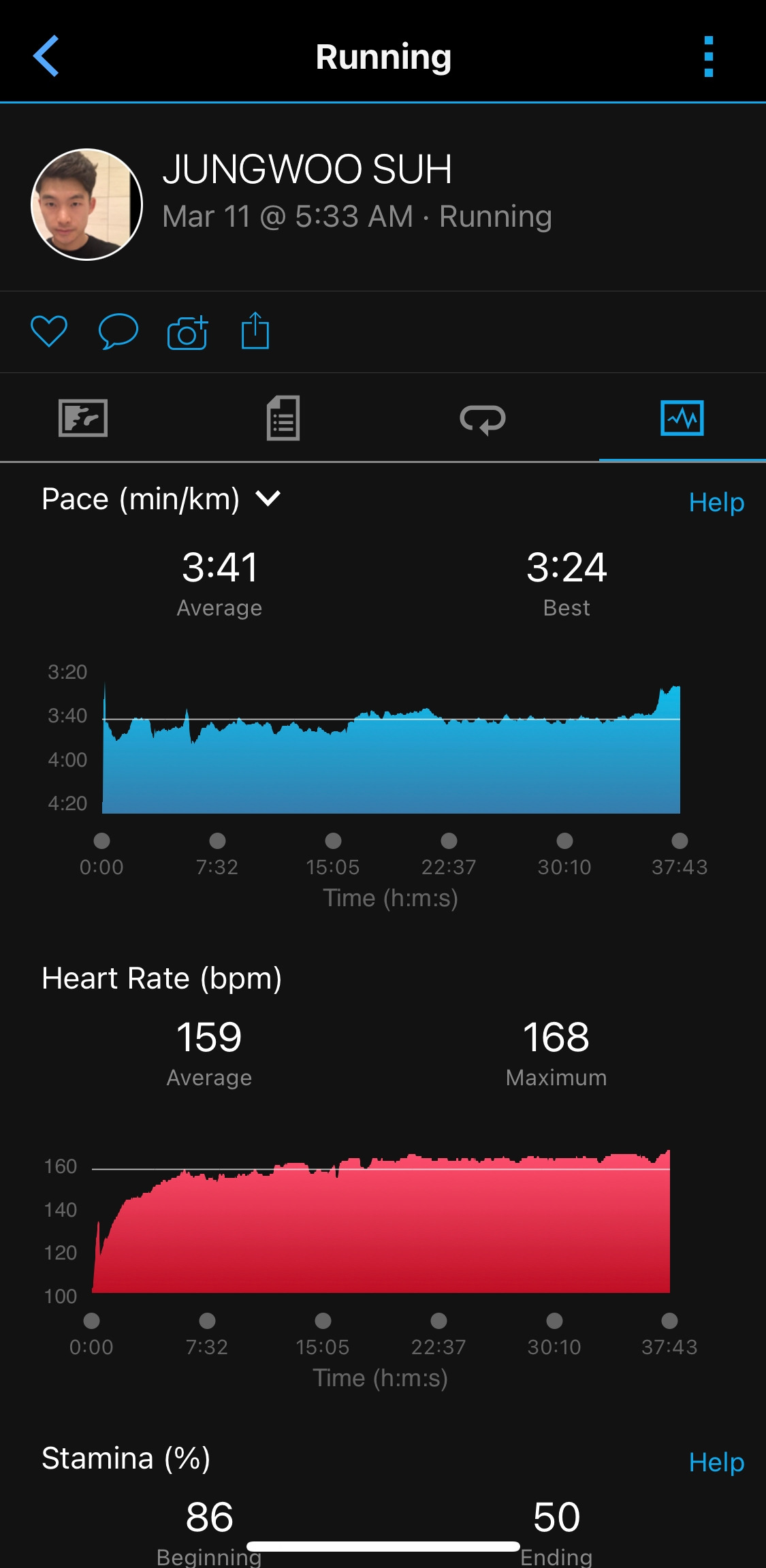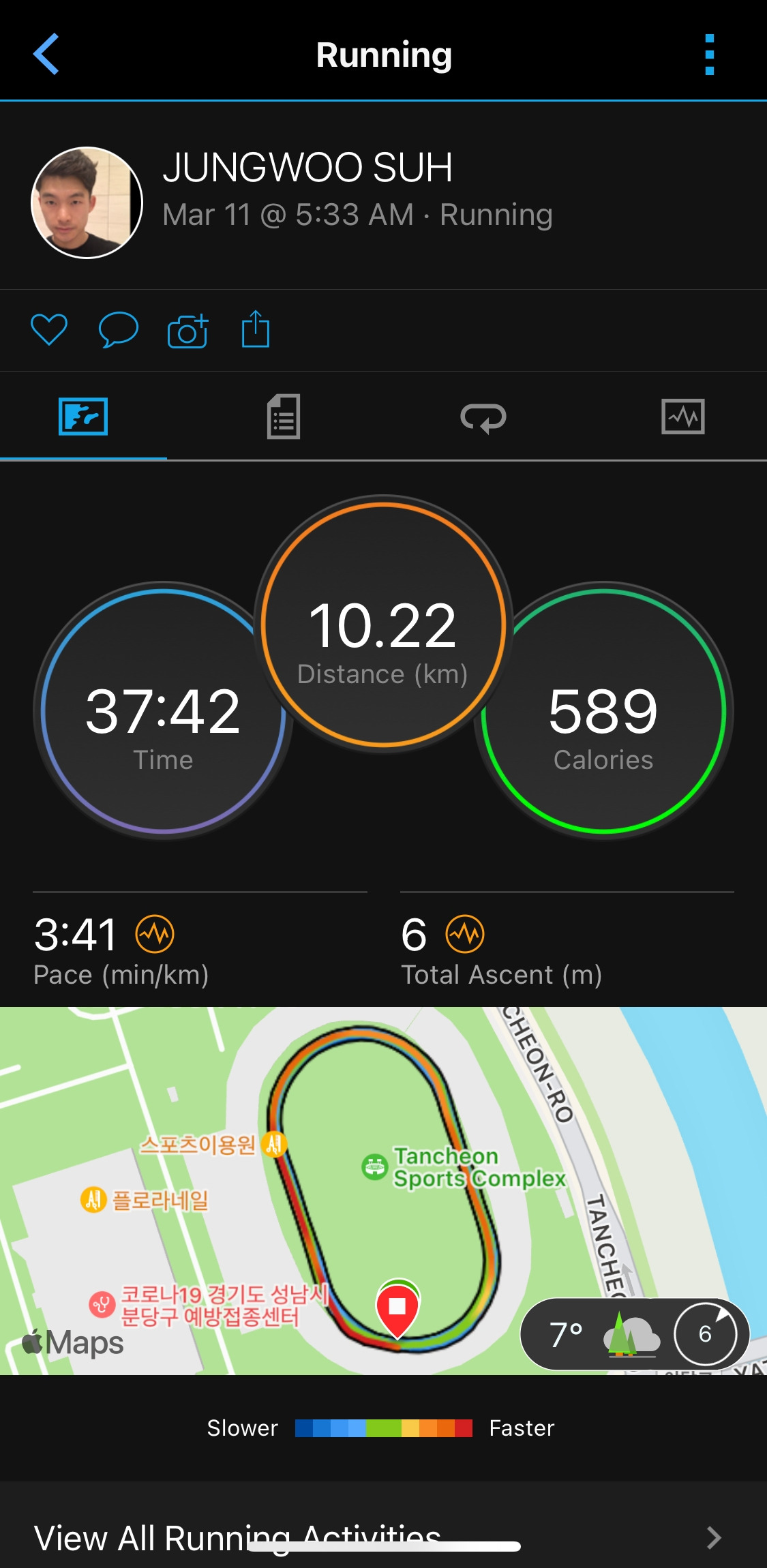 토요일 새벽 5시 10000m 트랙 달리기(37분 42초)