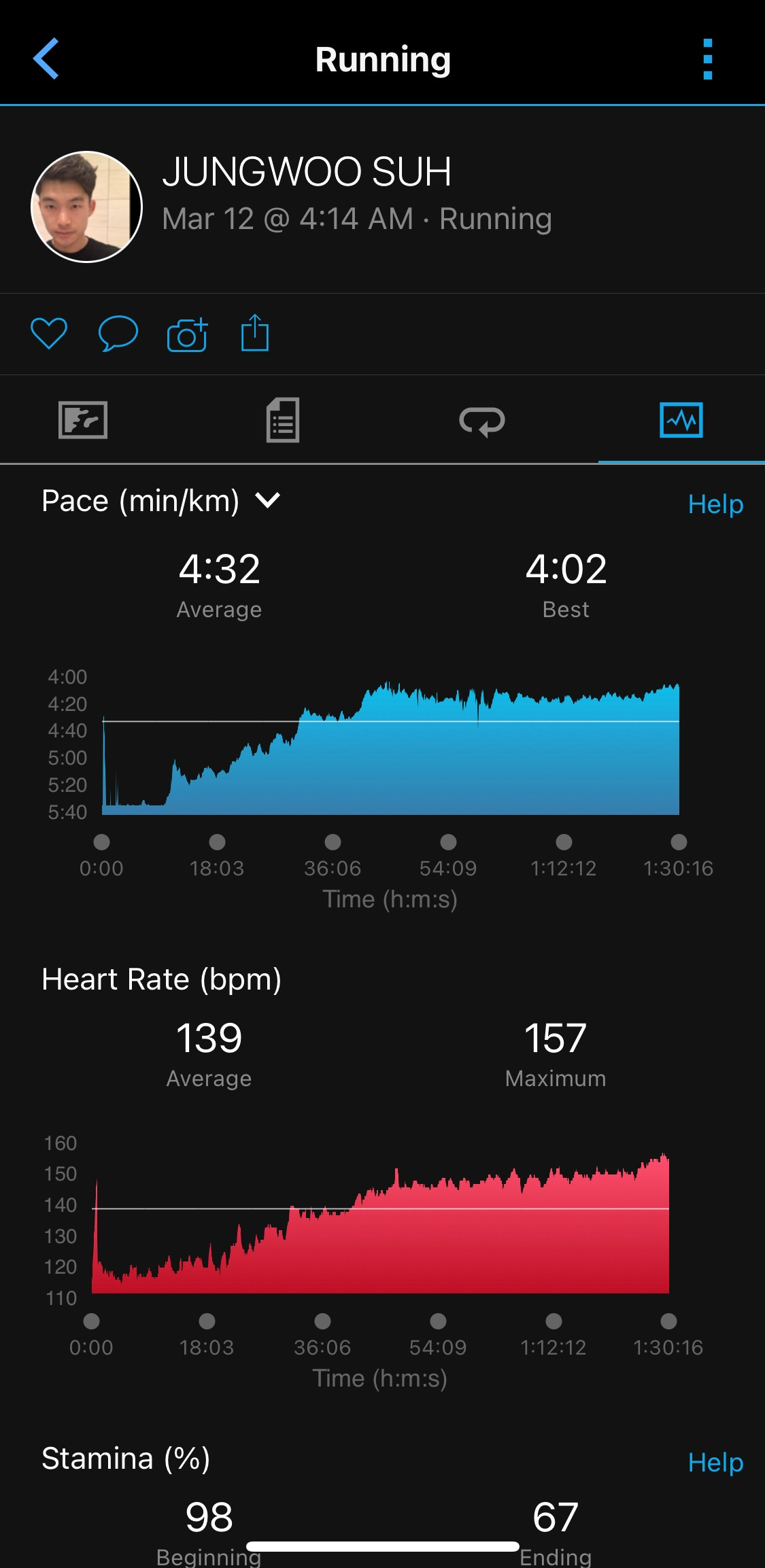 일요일 새벽 4시 90분 트랙 조깅(20km)