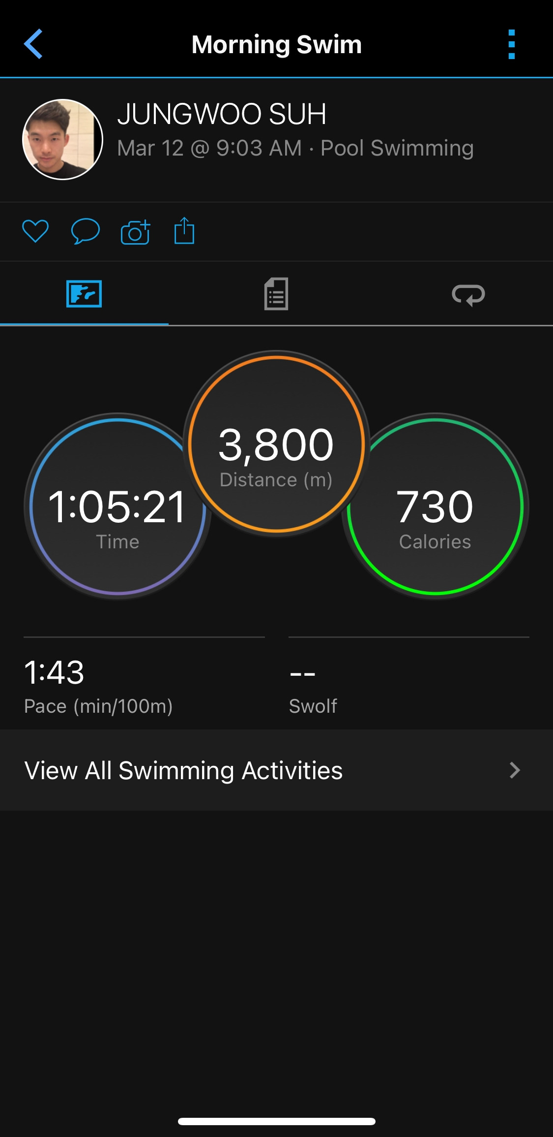 나 자신이 중점을 두고 있는 주력운동은 3종 중 마라톤이다. 다가오는 3월 19일 서울마라톤(동아마라톤)을 불과 일주일 앞둔 시점이라, 장거리수영대회 참석이 다소 부담스러웠다. 하지만 나 스스로 자기 객관화를 통해 수영에서의 내 실력과 위치를 깨닫고 파악할 수 있는 메타인지, 한마디로 내 분수를 알기 위해 참가를 결정하였다. 또한 결정적으로 요즘 매주 1회 수영을 배울 때마다 실력이 향상되는 재미가 가득하여 대회에서도 테스트하고 싶은 마음이 컸다. 수영이 한창 재미있어 최근에는 하루 50분이라도 좋다며 주 4~5일 자유수영 연습을 꾸준히 하고 있다. 토요일 수업에서 배운 내용을 일주일 동안 연습하며 몸통 롤링의 감각, 몸을 띄우는 감각 등 매주 하나씩 몸으로 느껴 기술을 습득하고 100미터 500미터 1000미터 기록이 조금씩 단축될 때마다 큰 기쁨이 가득하다. 나이 마흔이 넘어서도 그리고 나 혼자보다 가족과 함께 하는 시간이 더욱 많아지는 시기임에도 계속 수영실력이 향상되는 재미가 있다. 배우고 익히고 성장하는 것, 운동 취미를 즐기는 아빠철인으로서 이것이야말로 축복이다