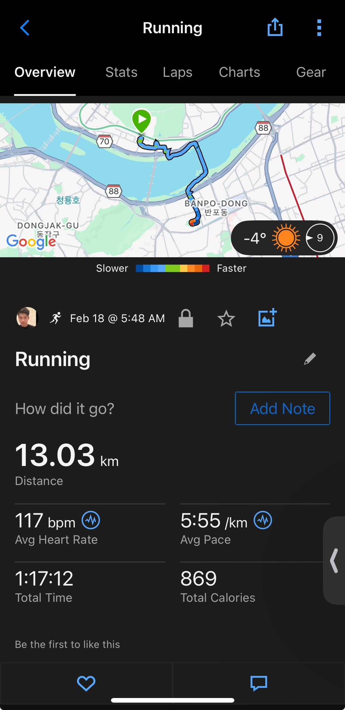 기온이 크게 낮지는 않았지만 바람이 많이 불어 체감온도는 더욱 춥게 느껴지는 오늘 새벽이었습니다. 집에서 반포 트랙까지 천천히 조깅 이동 후 트랙에 도착하여 몇 바퀴 더 돌고, 1000m 질주 후 집으로 조깅 복귀했어요. 조깅과 1000m 질주 조합은 매일 달리기를 할 때 가장 일반적이고 제 자신도 무척 선호하는 훈련 중 하나입니다.