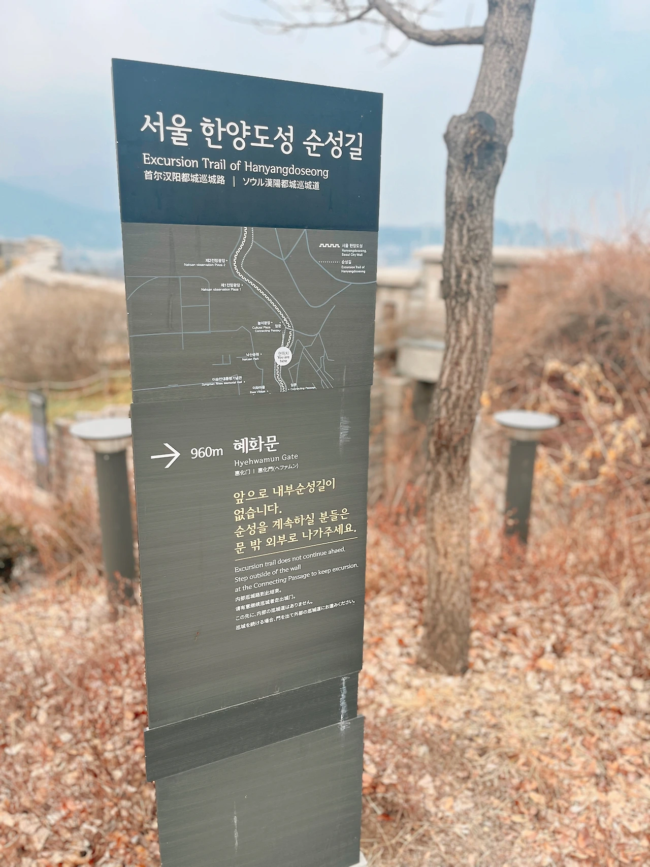 가족과 함께 갔던 길은 혜화역과 가까운 낙산공원에서 출발하여 동대문역(흥인지문)으로 연결되는 2.3km 순성 길입니다. 집에서 지하철 4호선으로 혜화역, 동대문역 그리고 명동역까지 이동하기 편리하고, 대학로(미니소), 이화벽화마을과 흥인지문 등 아내와 아이가 지루하지 않게 둘러볼 수 있을 것 같아 제가 선택했습니다.