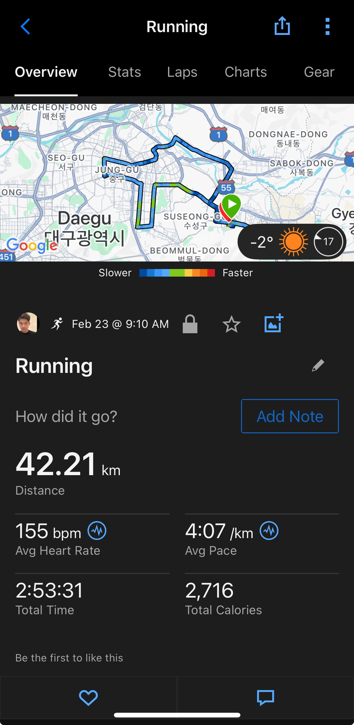 유니버시아드 대로로 올라서면 다시 평지입니다. 몸 상태는 괜찮았던 것 같습니다. 다시 속도를 올려보니 3분 40초 대, 30초 대 페이스까지 올라옵니다. 기록에 큰 변화를 주기에는 이미 늦었지만 마지막까지 최선을 다하는 것이 마라토너입니다. 대구스타디움 주차장 오르막을 다시 올라 스타디움 둘레길을 조금 달려간 다음 경기장 트랙으로 들어갑니다. 200m 정도 트랙을 달리고 피니시. 2시간 53분 29초. 무척 힘든 대회였지만 묘하게 다시 도전하고 싶은 대회입니다.
