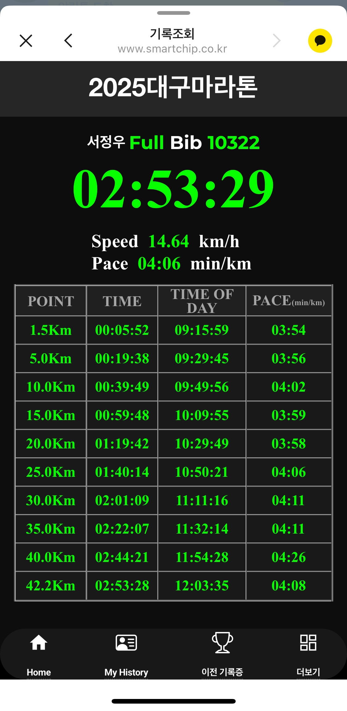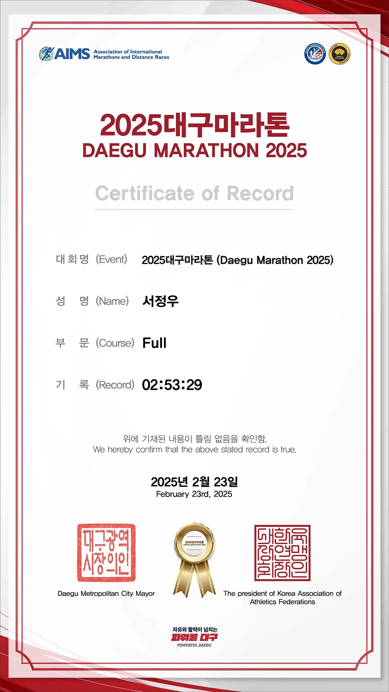 대구마라톤 Full: 2시간 53분 29초