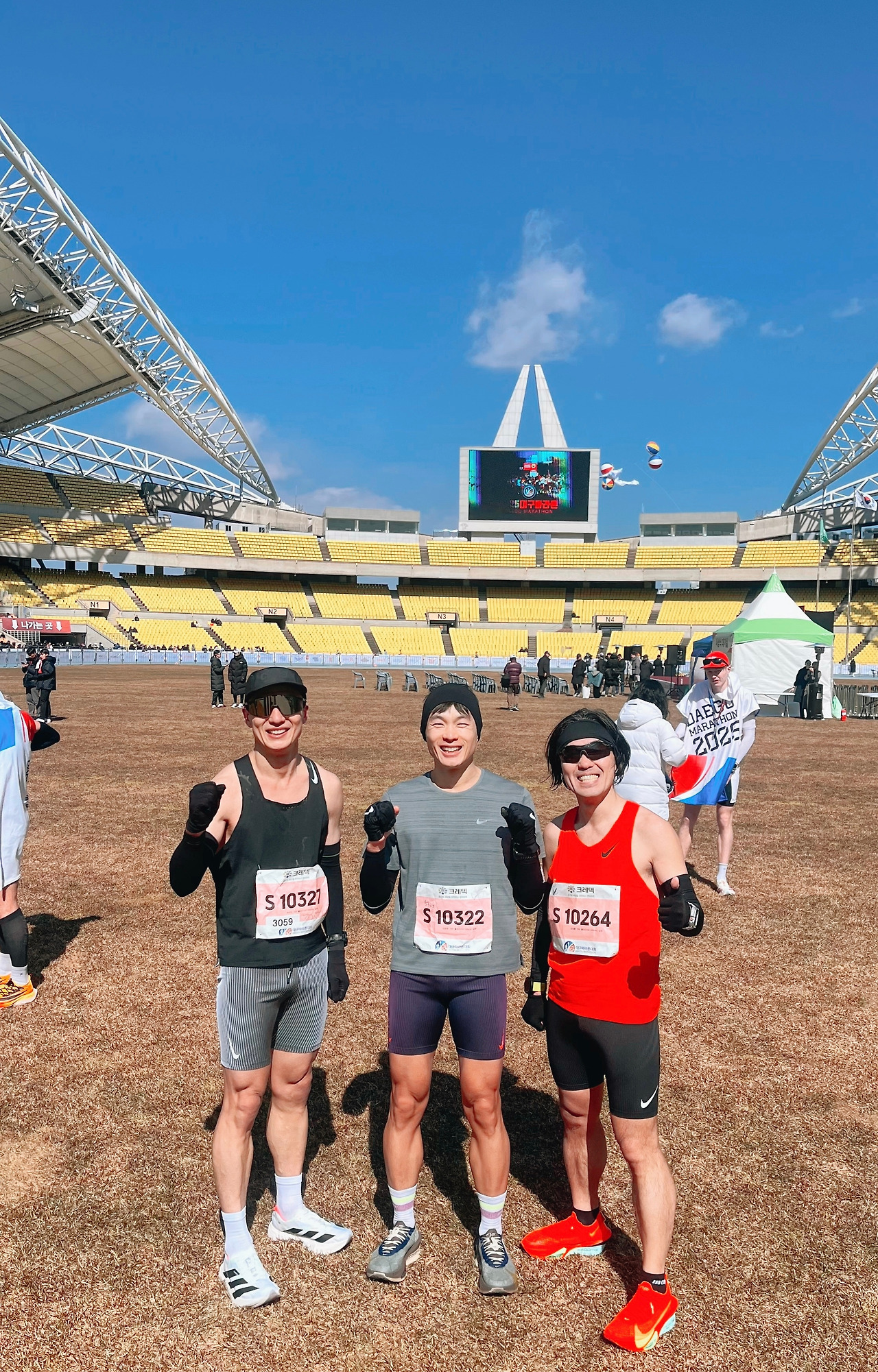 경기보다 더 힘들었던 건 마치고 물품보관소로 이동하고 옷을 갈아입을 때까지 과정이었습니다. 피니시 마치고 미키 님과 슈땡 님이랑 마사지를 받으려 했는데 저는 체온이 점점 떨어지는 느낌이 심상치 않아 마사지는 받지 않고 물품보관소 탈의실로 직행했습니다. 재난 영화 수준으로 바람이 불어 탈의실 천막이 들썩거려 밖에서 제 알몸이 다 보일 정도였지만 너무 추워서 그런 건 걱정할 여유도 없이 ’생존‘을 위해 서둘러 옷을 갈아입었어요. 손과 발이 얼어붙어 재빠르게 움직여지지 않아 애먹었습니다. 2월 말은 여전히 날씨 변수가 있는 시기이니 내년에는 3월 초에 열리면 좋겠습니다. 서울마라톤 참가 인원도 분산된다면 더 좋겠네요.