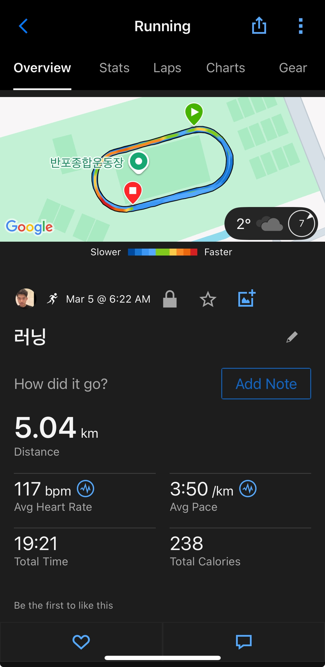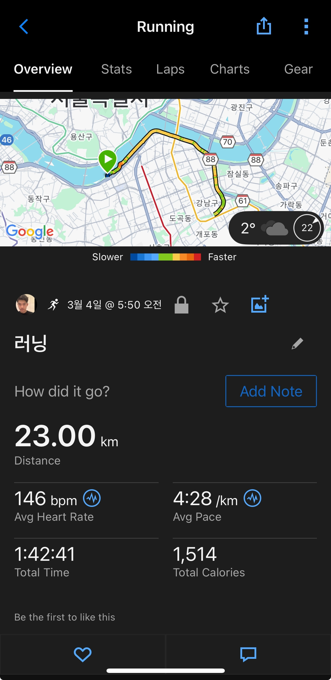어제 화요일에는 새벽 반포 한강공원에서 마린 님과 100분 러닝을 하며 마지막 10분은 대회 페이스까지 올렸고, 오늘 수요일에는 반포 트랙으로 이동하여 5000m 1세트 러닝을 했습니다. 연휴와 입학 시즌이 겹쳐 서울 여행 왔던 고향 친구 가족들과 광장시장, 익선동 등 함께 둘러보며 과식하고, 어제 입학식을 마치고 강남 고속터미널 근처 <텍사스 데 브라질>에서 고기와 샐러드 폭식을 하였더니 제 몸무게가 74.5kg까지 올랐습니다. 2016년 3종과 마라톤을 제대로 시작한 이후 처음 경험하는 최고 몸무게입니다. 역대 최고 몸무게인 77kg과 비교해도 큰 차이가 나지 않습니다. 무척 몸이 무겁고 1km 3분 50초 페이스도 힘들게 느껴질 정도였습니다. 아내는 저보고 얼굴 보기 좋아졌다고 하네요.