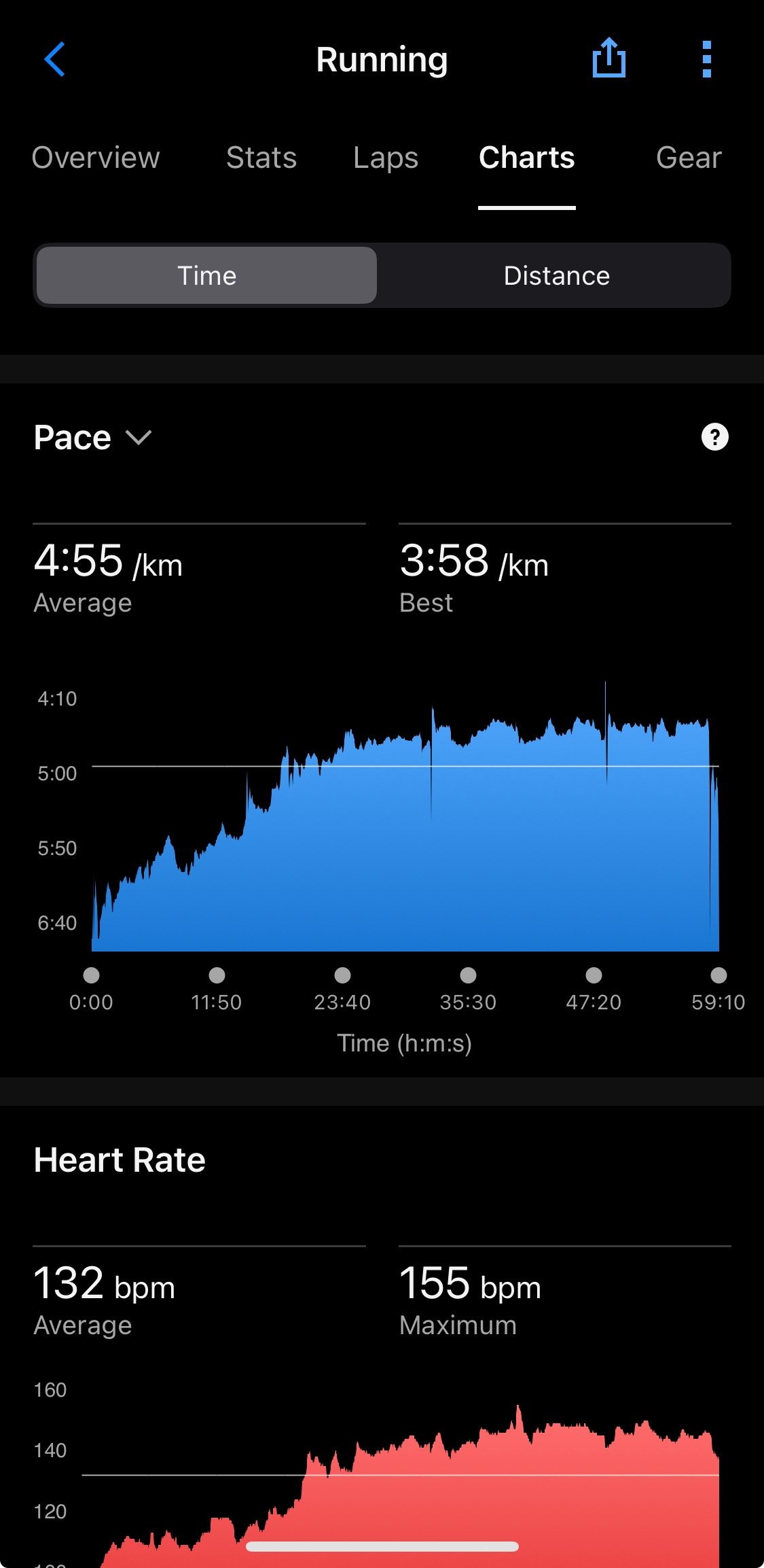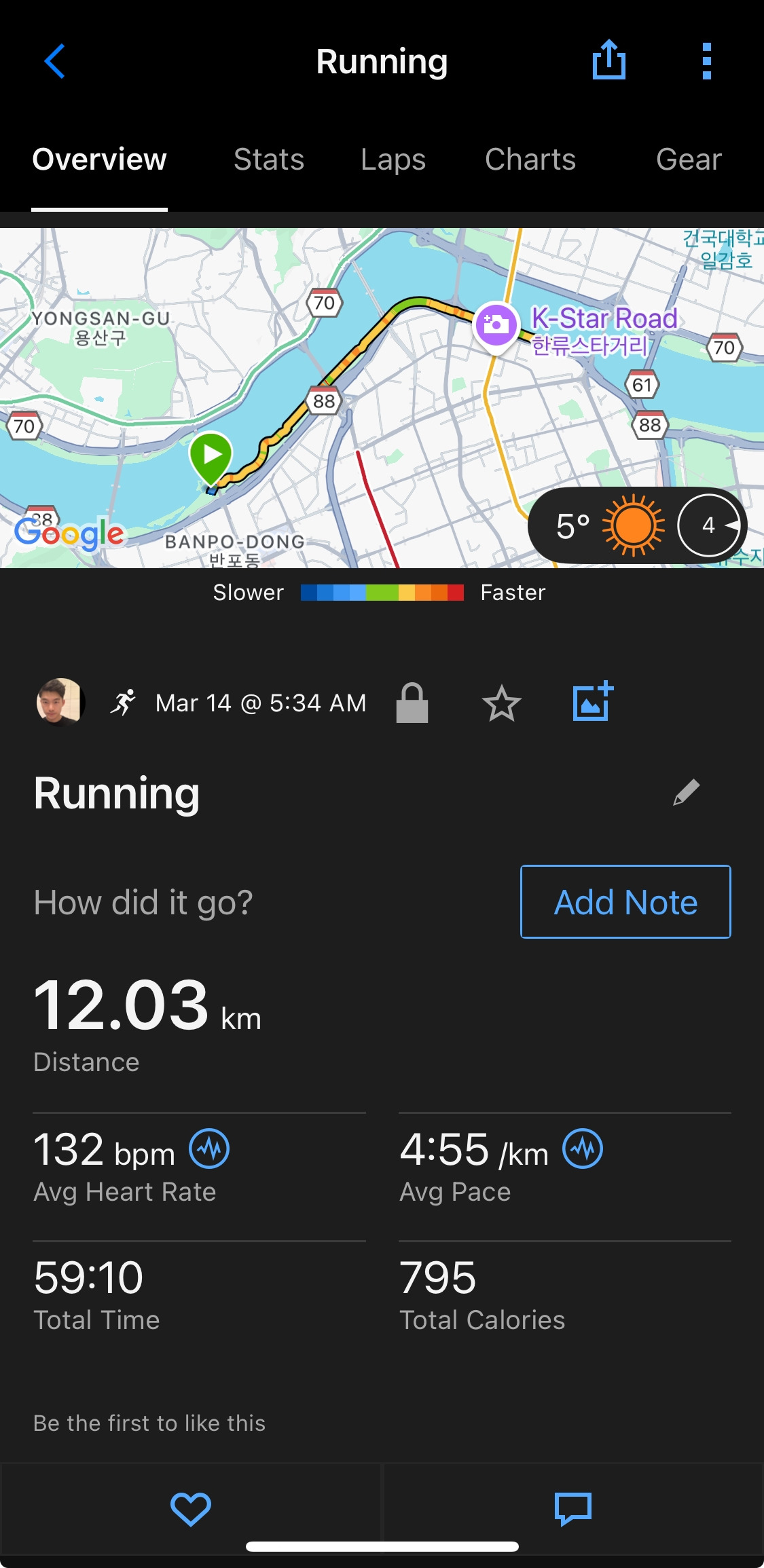 운동 강도: 가벼운 조깅 (마라톤 페이스보다 느린 5:00~5:30/km)