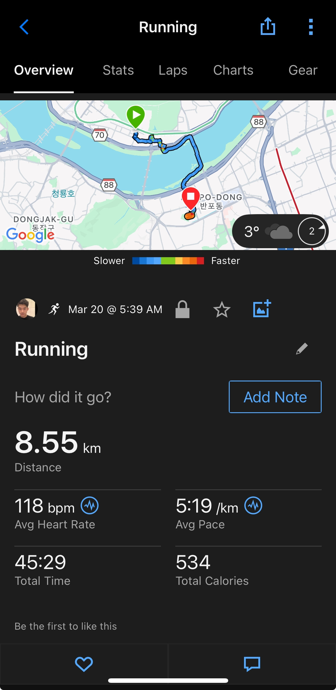 오늘 새벽에도 집에서 반포 종합운동장 트랙까지 조깅 이동, 약 40분 정도 가볍게 달린 후 트랙에서 1200m 조금 빠르게 달렸습니다. 400m 랩 타임 기준 86초, 84초, 81초. 지난 일요일 서울마라톤 풀코스에서 저는 전력으로 달린 것이 아니기 때문에 상대적으로 회복에 여유가 있습니다. 다가오는 주말부터는 달리는 거리를 늘리고 속도를 조금씩 높여 봄 훈련을 시작하려 합니다.