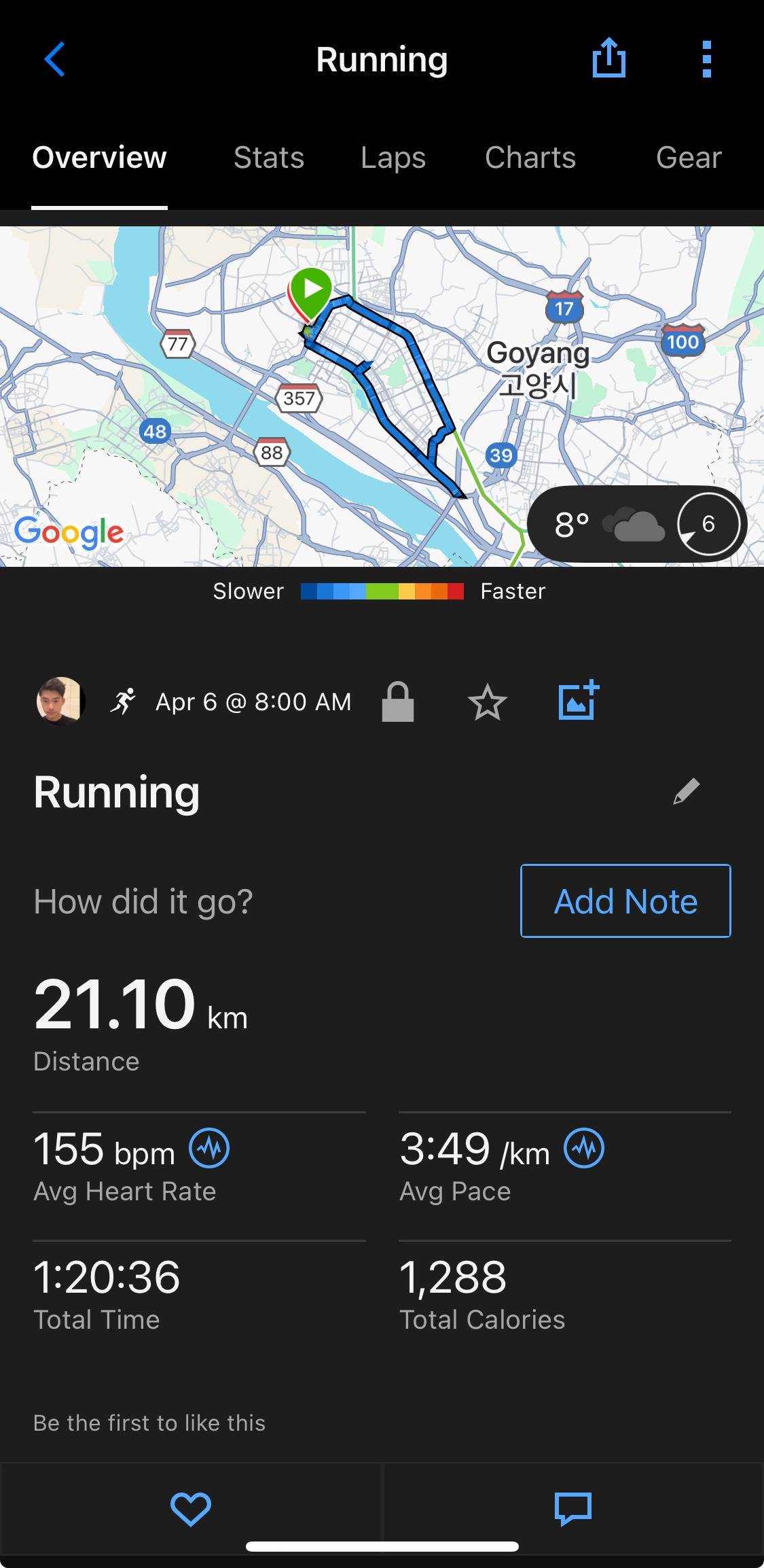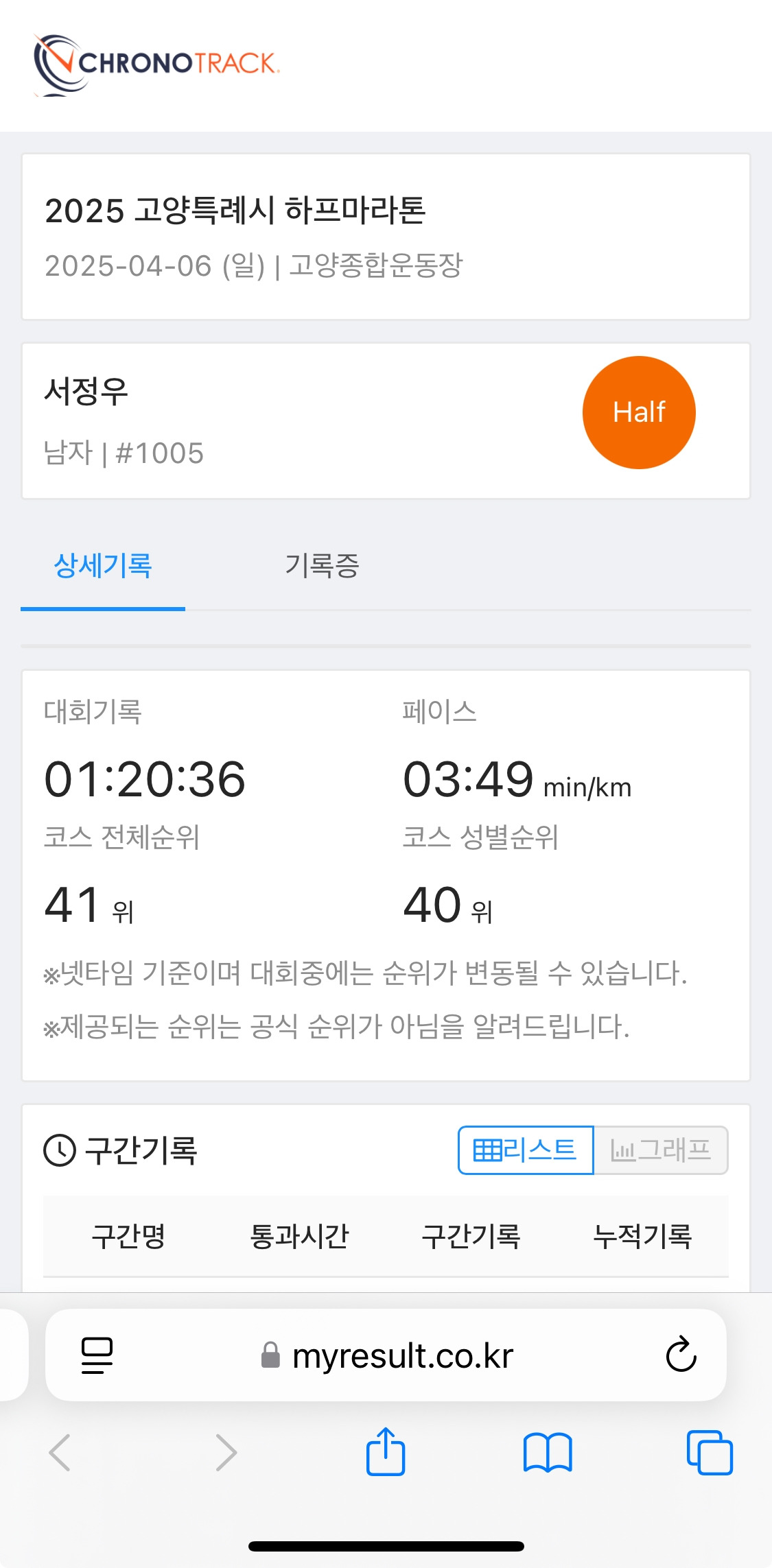 요즘 운동을 드문드문 띄엄띄엄하다 보니 저도 제 몸 상태가 어떤지 몰라서 1km 3분 50초 페이스로 뛰어봐야겠다는 마음이었어요. 처음부터 끝까지 3분 50초 이븐 페이스로 달렸습니다. 균일 페이스로 달리니 다행히 마지막 체력에 여유가 있어 어쩌면 1시간 20분 대 이내 들어갈 수 있지 않을까 계산했어요. 10k, 5k 종목 선수분들과 합류하는 17~18km 지점에서부터 숨소리 거칠게 헥헥 캑캑 거리면서 조금씩 페이스 올려봤지만 79분 대는 무리였고, 생각했던 80분 대로 무사히 마쳤어요. 피니시 통과하고 나중에 다시 계산해 보니 애당초 막판 페이스 좀 올린다고 될 시간이 아니었어요. 아마 달릴 때 계산 머리가 제대로 작동이 안 되었나 봐요. 1시간 20분 36초.