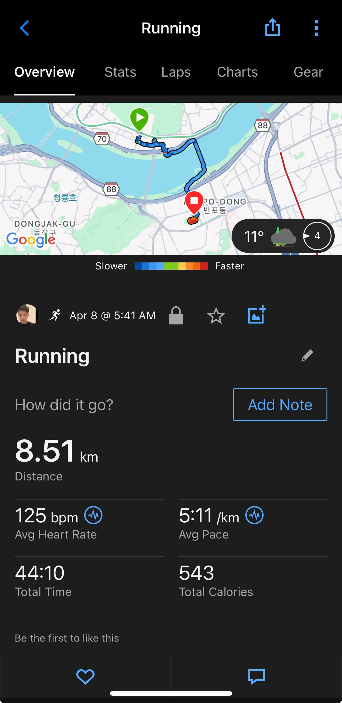 평소보다 늦은 새벽 5시 30분에 집에서 출발하여 반포로 이동, 트랙에 도착 후 빠른 조깅을 조금 더 이어가고 45분 만에 조깅 종료. 잠깐 휴식한 다음 200m 질주(36~37초) 3회 달리고 다시 집으로 돌아왔습니다. 트랙에서 운동이 짧아 훈련 시간이 부족했지만 200m 질주로 마무리했더니 몸 감각과 기분은 좋았습니다.