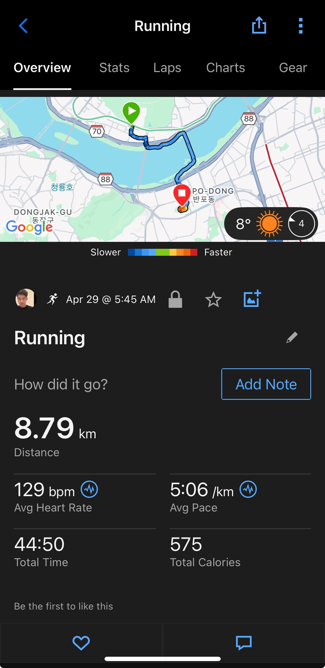 오늘은 40분 정도 조깅하고 반포 트랙에서 1000m 조금 빠르게 달렸습니다.