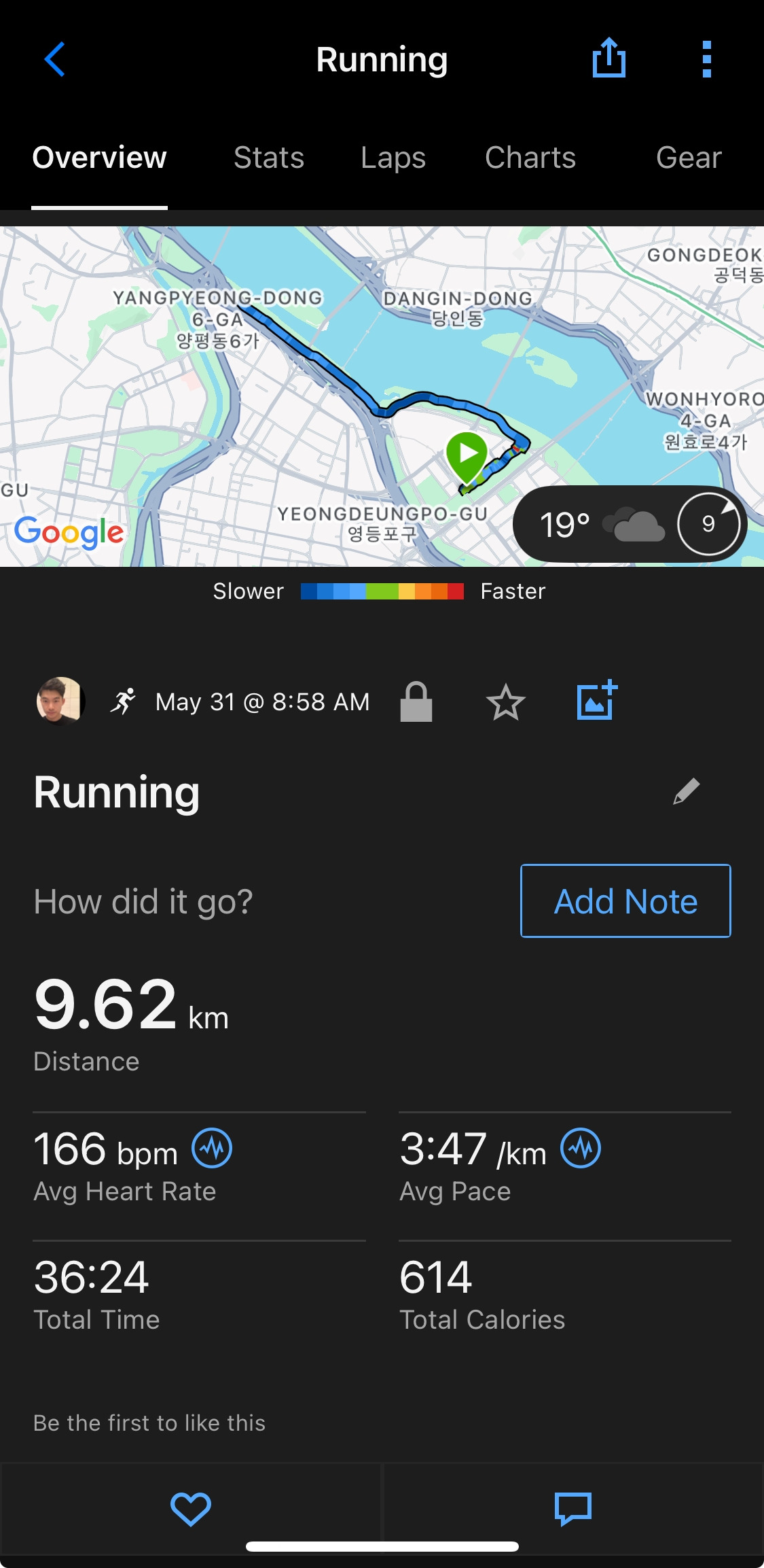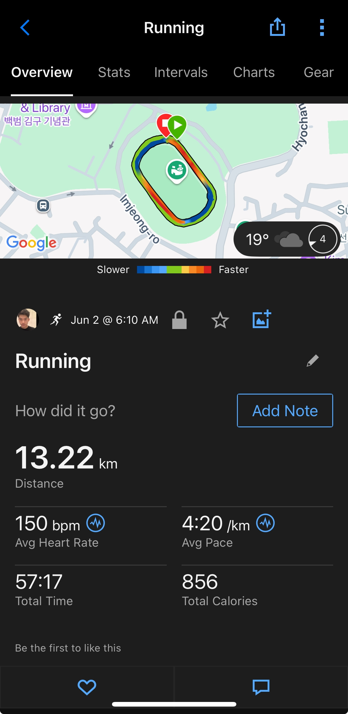 월요일 아침. 효창운동장 번개 달리기입니다. 시작은 천천히 달리지만 배문 큰형님들 조깅 페이스는 저에게 거의 대회 지속주 페이스에 가깝기 때문에 3일 연속 10k 훈련하는 것과 같습니다.