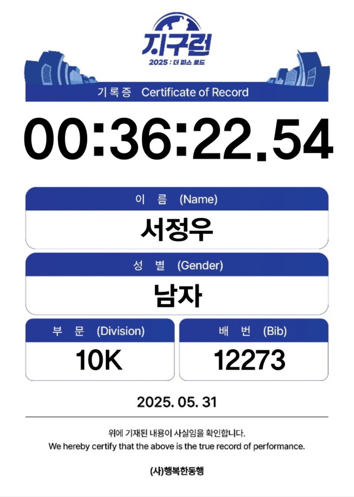 섭씨 영상 20도를 훌쩍 넘고 체감 기온으로는 30도에 육박하는 더운 날씨인데, 대회 주최 측이 잘못했습니다. 이런 날씨에는 새벽 5시 정각에 대회 시작해야 하는데, 9시 정각 출발이라니. 주최 측 잘못입니다. 내년에도 같은 시기, 같은 장소에서 열린다면 새벽 4시 집결, 5시 출발 기대합니다. 그럼요. 러너에 대한 예의가 있다면 새벽 5시에는 대회 시작해야 합니다. 거리가 짧았습니다.