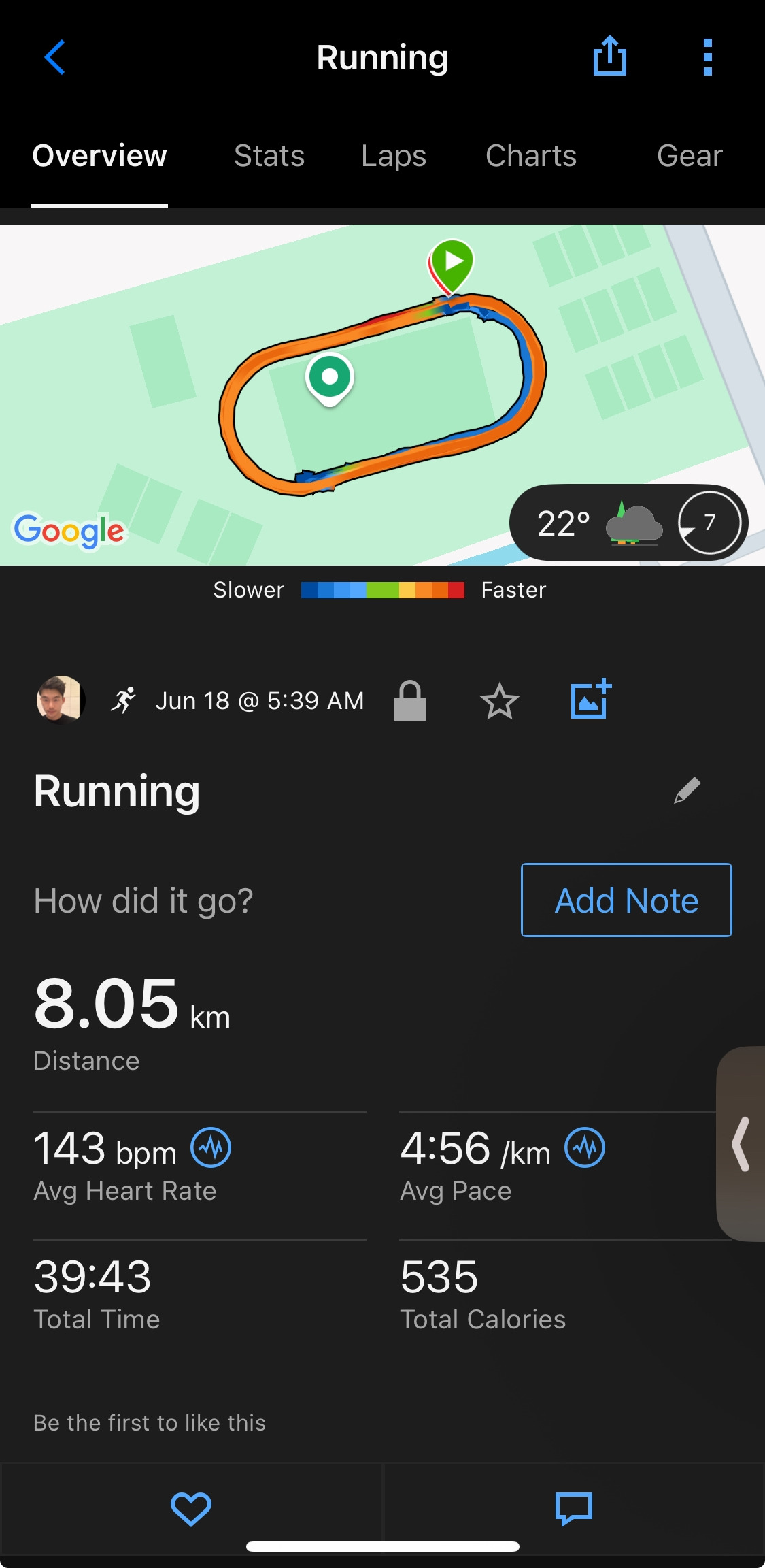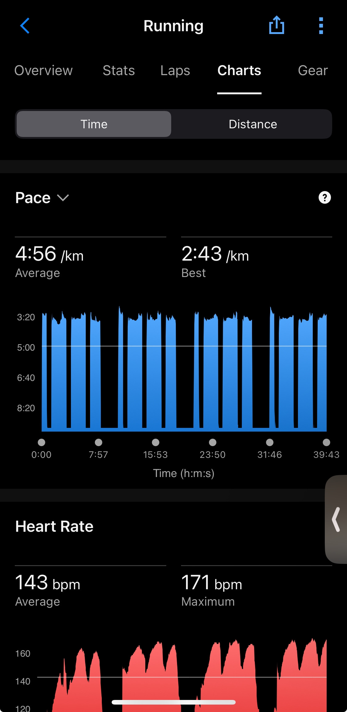 오늘 프로그램 페이스는 부담이 덜하고 여유가 있어서 200m와 400m를 각각 2~3초 또는 1~2초 조금씩 빠르게 달렸다. 12세트 완료 시점이 다가오며 힘든 적도 있었지만 혼자 달린 것이 아니었기 때문에 그럭저럭 견딜만하였다.