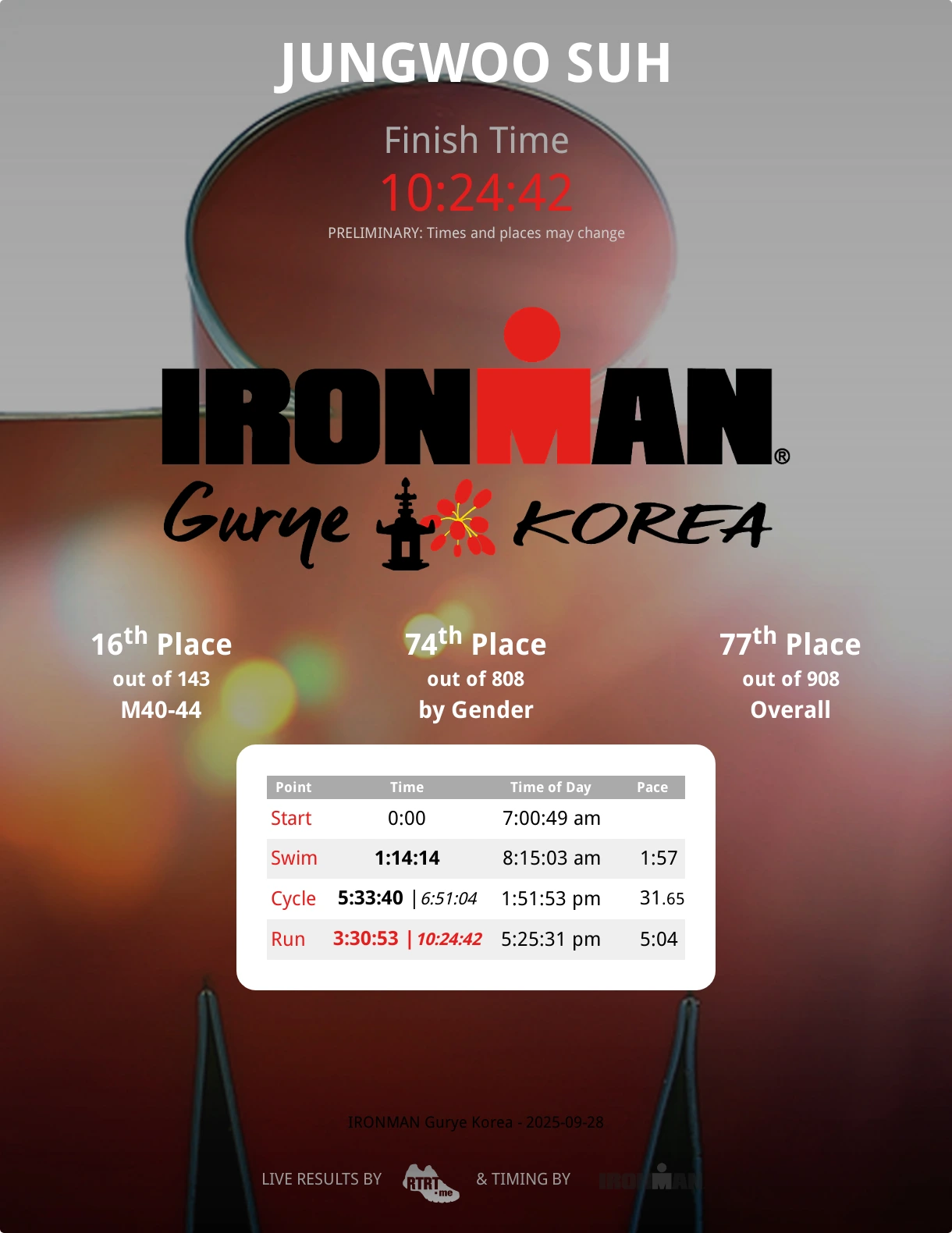 올해는 철인 3종에서 지도사 자격증을 얻었고 대회를 잃었던 시즌이었습니다. 시험, 주말 연수 일정에 훈련은 소홀했고 신청했던 대회는 모두 취소했지만, 운 좋게도 참가비 가장 비싸고 취소/양도 안 되는 아이언맨 구례에는 참가하여 1년 1킹코스 숙제를 무사히 마쳤습니다.