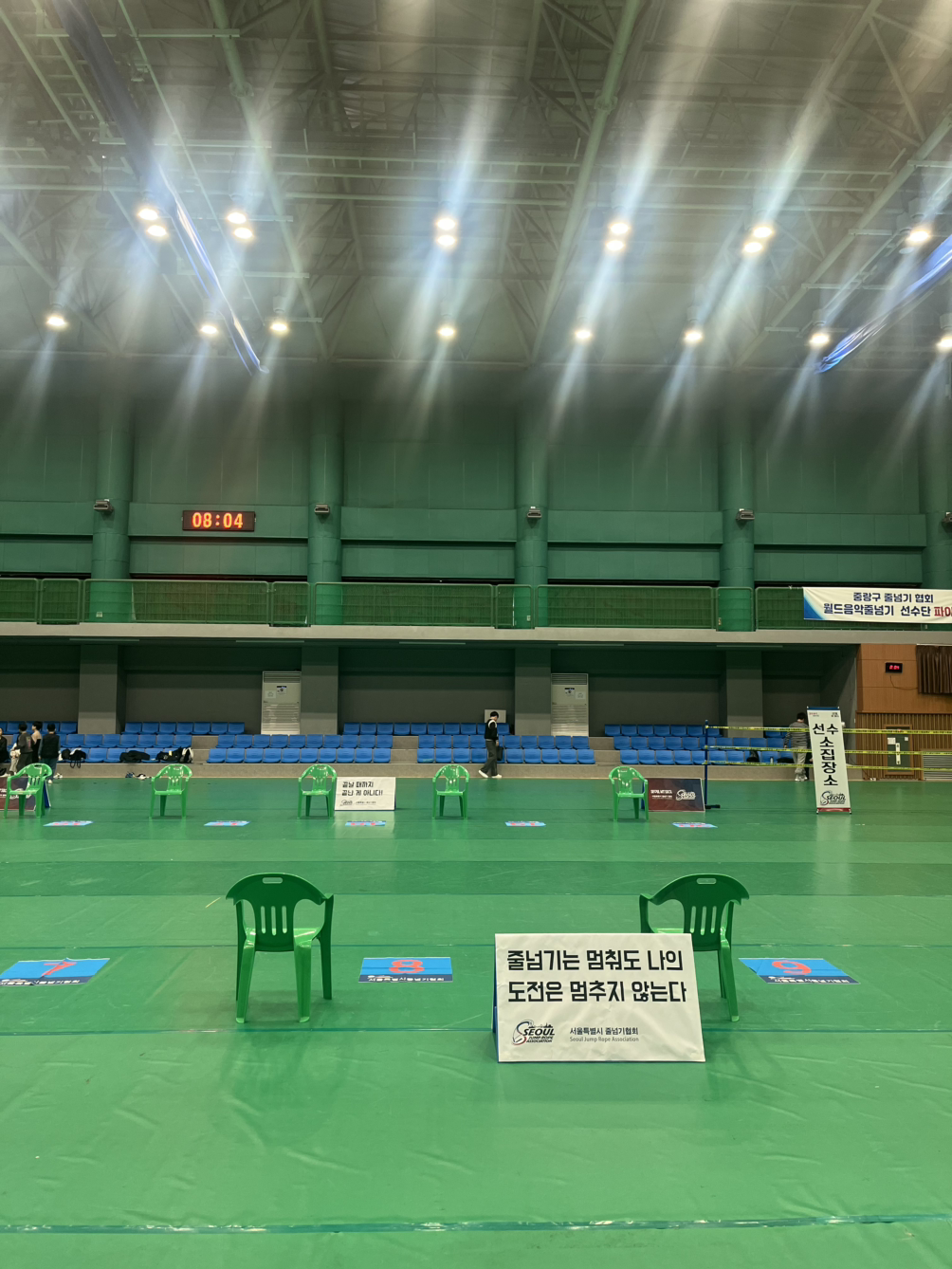 일찍 도착하길 잘 했다. 이전 후기에서 사진을 봤을 때 초록색 바닥이 매트인지 아니면 딱딱한 강당 바닥에 초록색 천을 덮은 것인지 정확히 알 수 없었다. 매트가 아니라 딱딱한 바닥이다. 아마 수십, 수백 명 사람들이 밟고 뛰면서 긁히고 부서질까 봐 비닐 덮개를 깔아놓은 것 같다.
