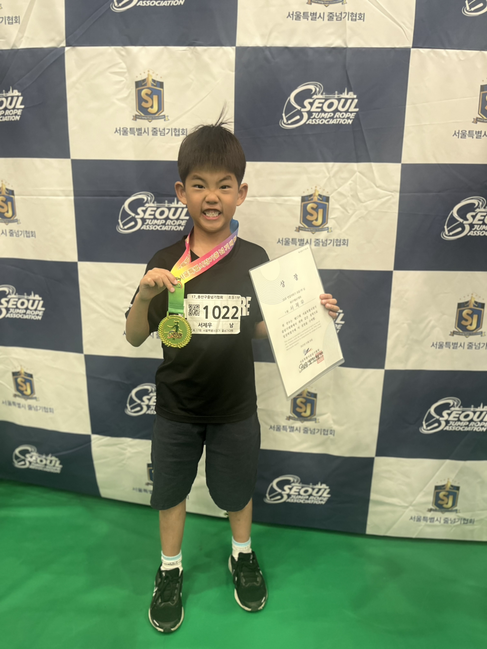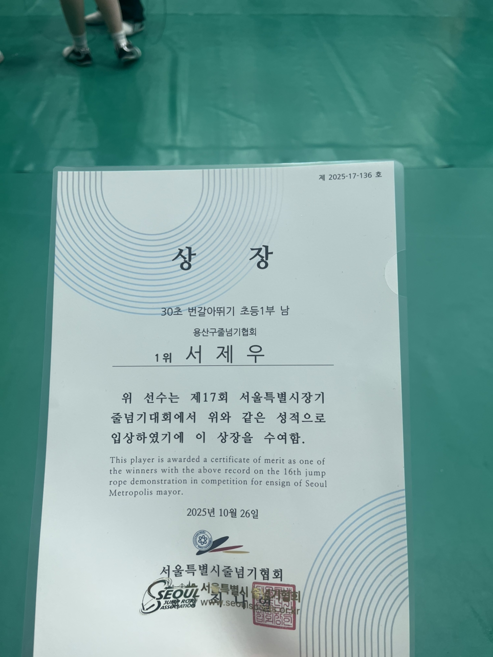 초등 고학년 학생들 중 OO줄넘기협회 유니폼을 단체로 입고 있던, 대표팀 선수로 보이는 학생들은 자세와 움직임부터 차원이 달랐다. 예전에 권투를 1년 동안 배웠던 적이 있는데, 선수들의 줄넘기를 직접 보며 나도 많은 도움이 되었다. 일반부도 있군. 내년에는 아들 줄넘기 코치님께 말씀드려 나도 참가해야지. 용산구 줄넘기협회 일반부 선수. 아들과 함께 출전하는 걸 상상만 해도 즐겁다.