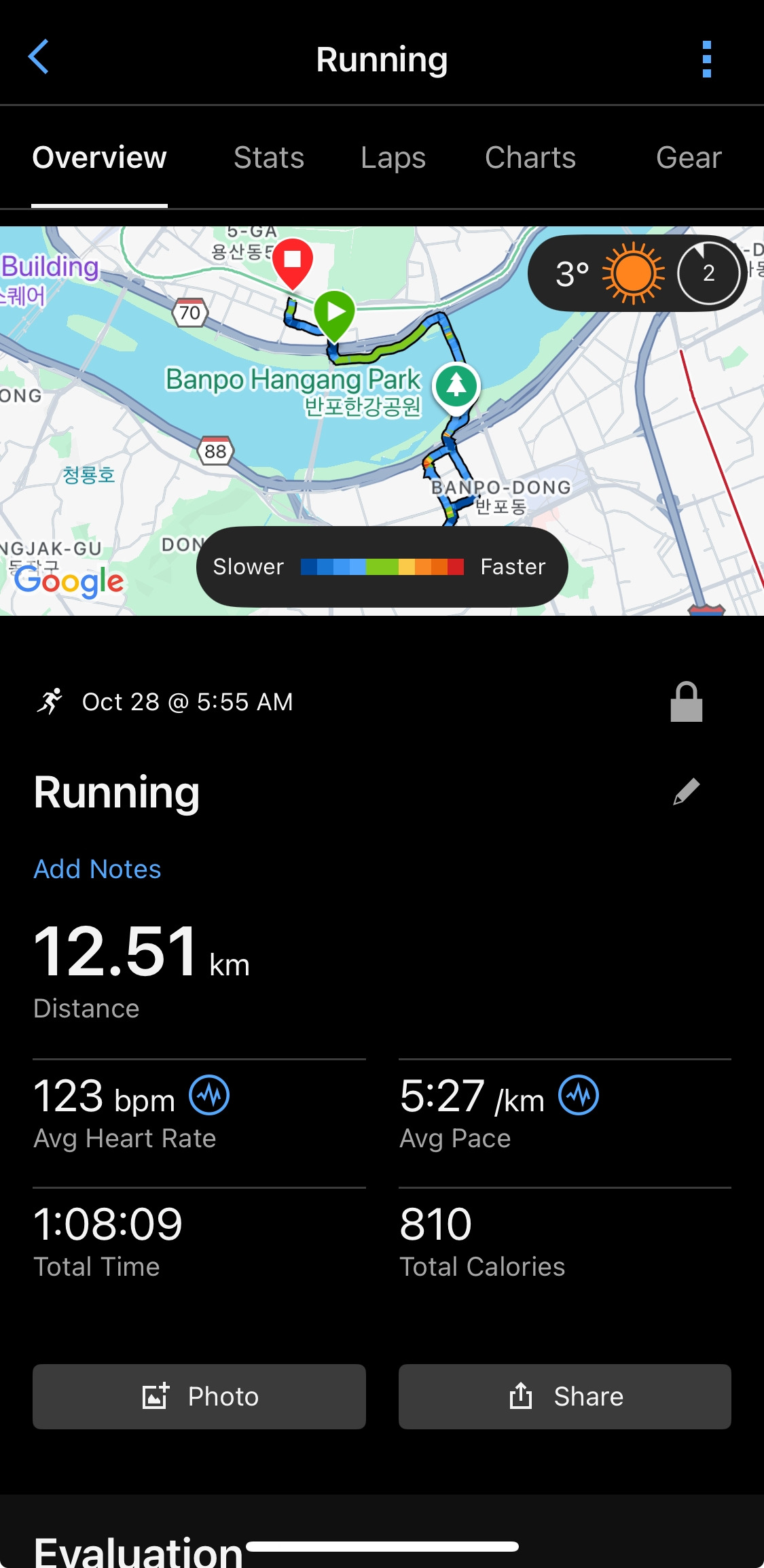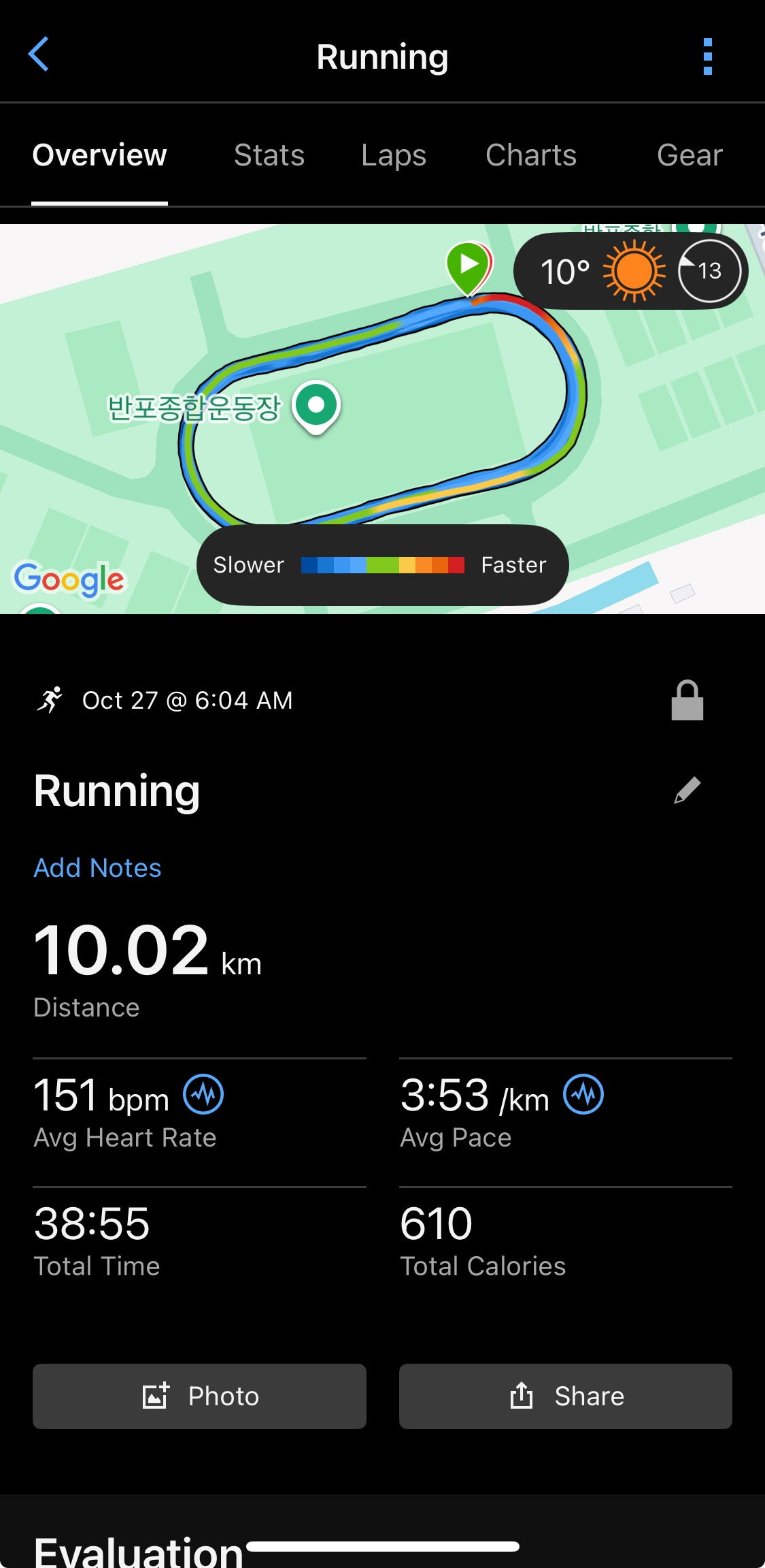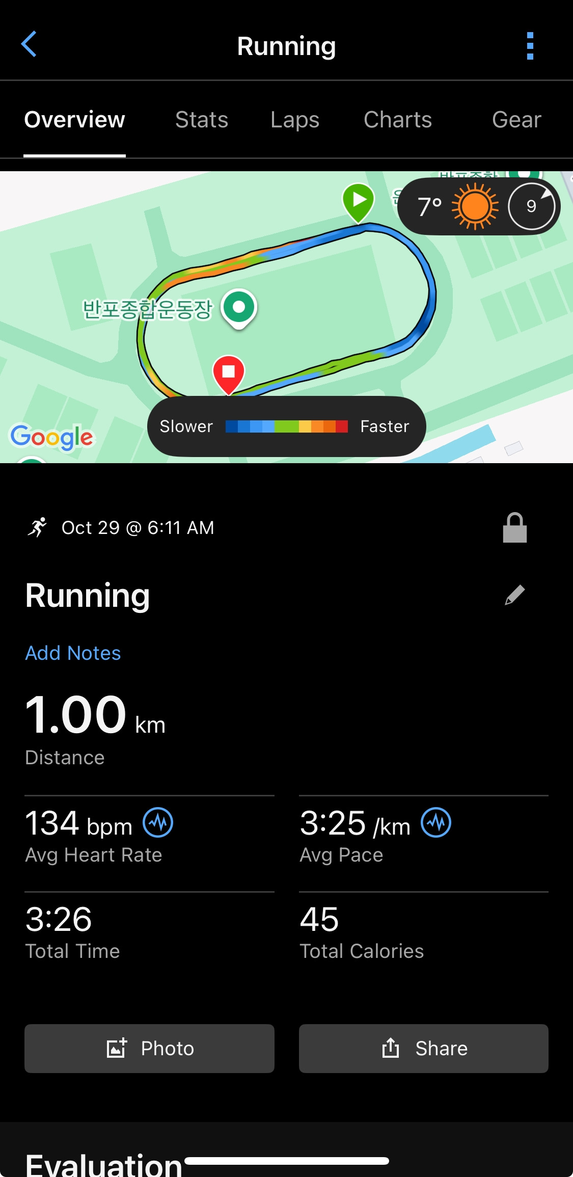 갑자기 추워진 날씨에 아직 몸과 마음이 준비되지 않았다. 준비 운동 수준의 페이스로는 몸에 열이 오르지 않아 천천히 느린 4분 10초 페이스로 시작하여 점점 빌드업으로 진행했다. 400미터 25바퀴 중 첫 5바퀴는 4분 10초 페이스. 다음 5바퀴는 4분 00초. 10바퀴는 3분 55초. 마지막 5바퀴는 3분 40초 > 3분 30초 > 3분 20초 페이스로 점점 빠르게.