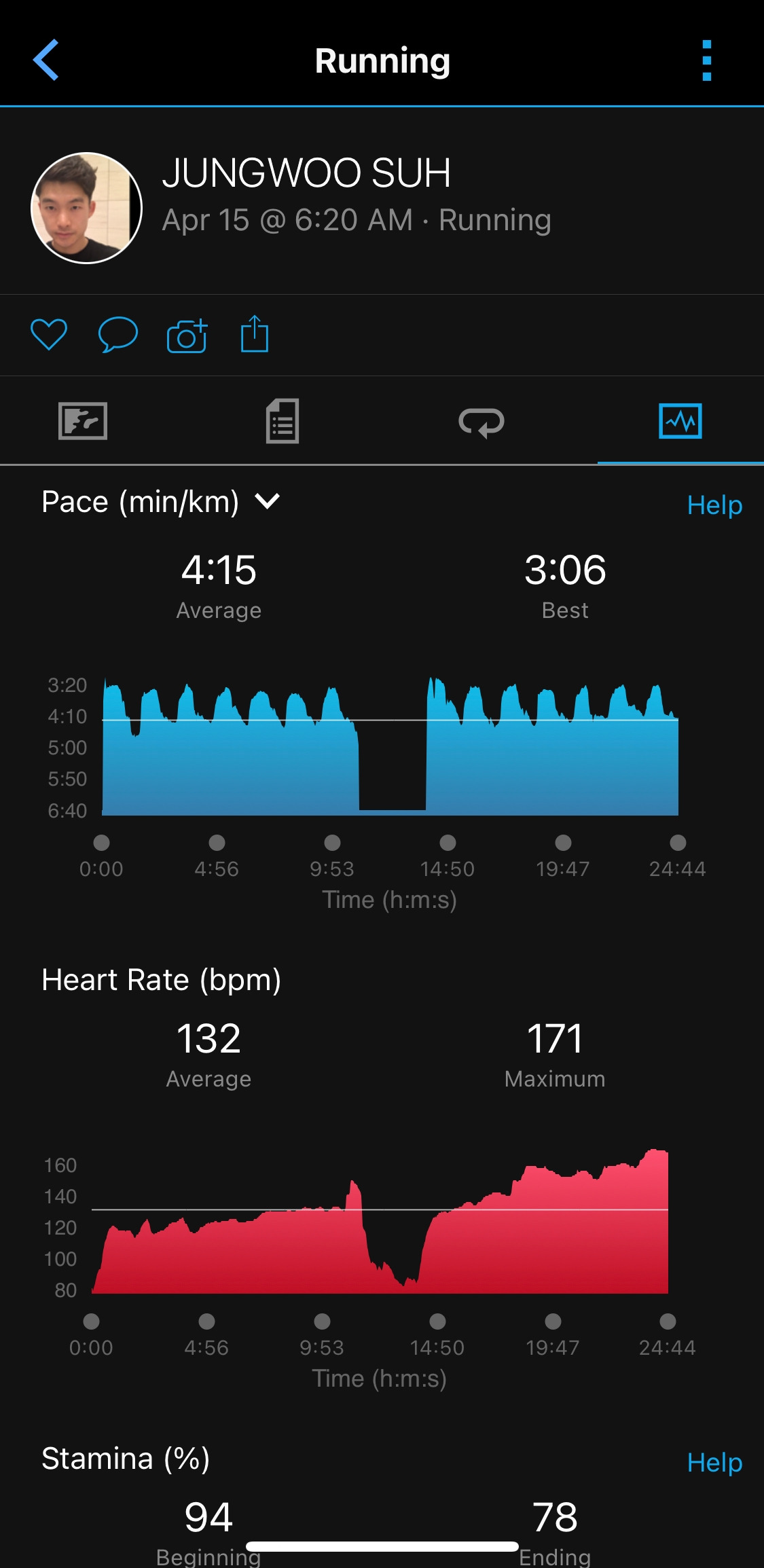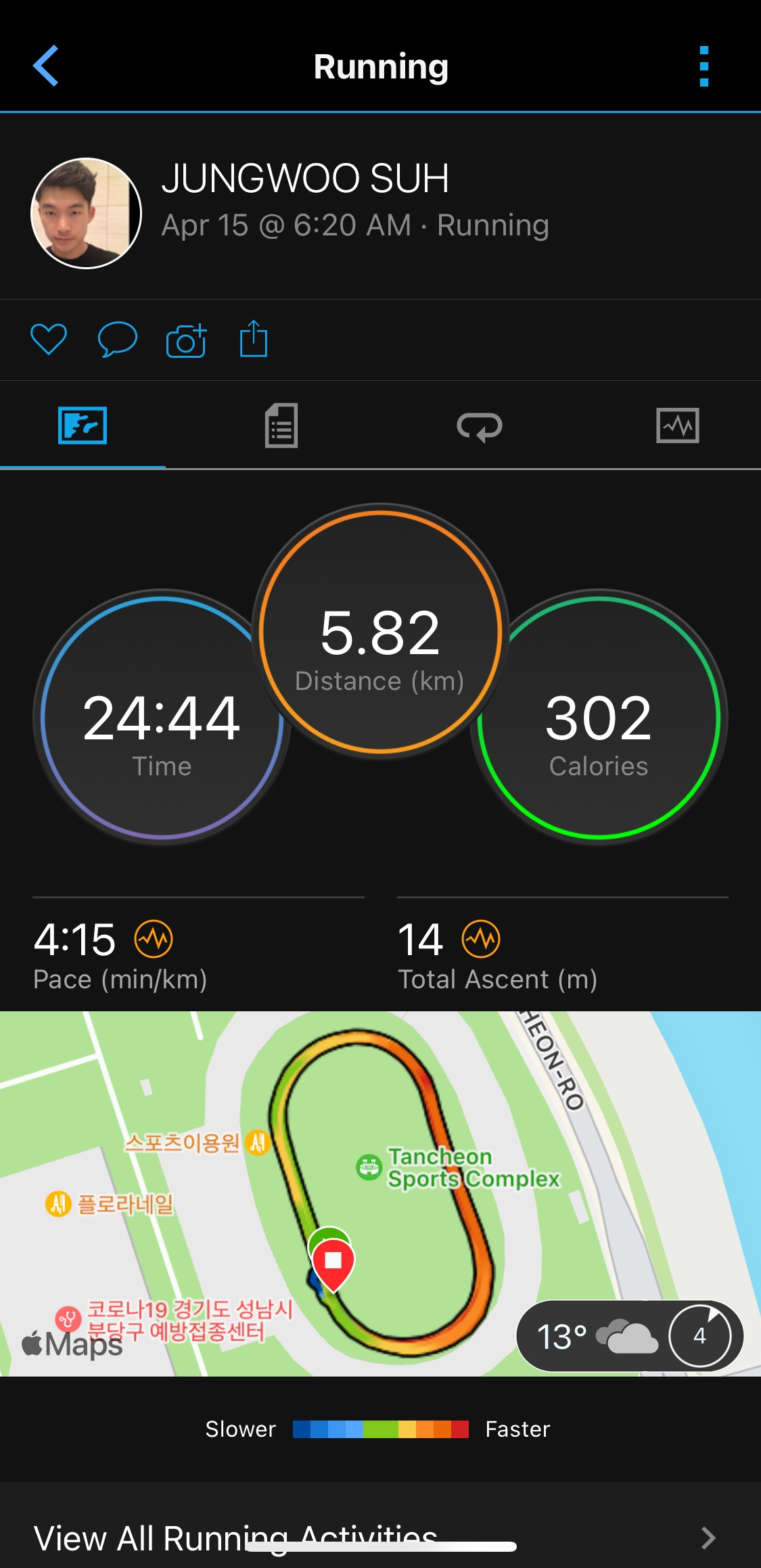 2023.04.15 토요일. 탄천종합운동장에서 200m + 200m 프로그램. 일요일 메인 훈련을 앞둔 신체 컨디션 상승을 목적으로. 200m 41” + 200m 53” => x14