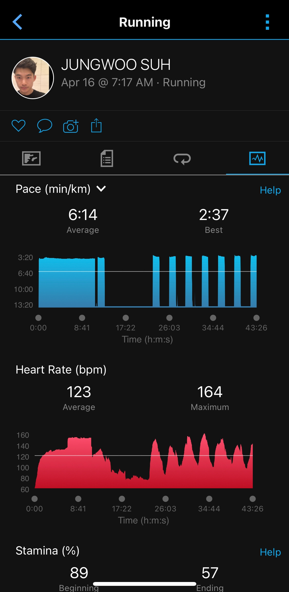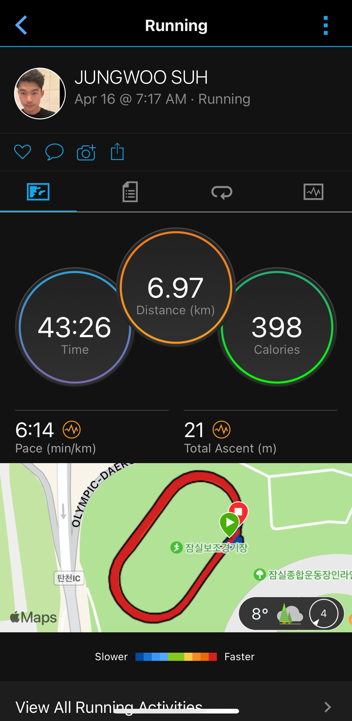 2023.04.16 일요일. 잠실보조경기장에서 4000m(3‘25“/km) + 400m 76” 프로그램. 4000m는 한꺼번에 소화하지 못하고 3200m를 달린 다음, 1바퀴 휴식 후 나머지 1바퀴를 달려 3600m. 400m 질주는 2분 휴식 간격으로 7회. 실내 마스크 해제 이후 아이가 유치원에서 감기 걸려오는 경우가 잦아졌다. 며칠 전에는 눈곱감기라는 아데노바이러스에 아이가 감염되었다. 어른에게는 좀처럼 전염되지는 않지만 감기 기운 자체가 있다 보니 아내와 나도 결국 목이 붓고 코가 따갑고 미열과 근육통이 가득하다. 지난 2월부터 몸 컨디션이 좋았던 시기를 다 합쳐도 2주일이 안 될 것 같을 정도로 힘든 환절기를 보내고 있는데, 이럴 때에도 운동의 끈을 놓지 않고 다가오는 대회 시즌을 준비하는 것이 좋다