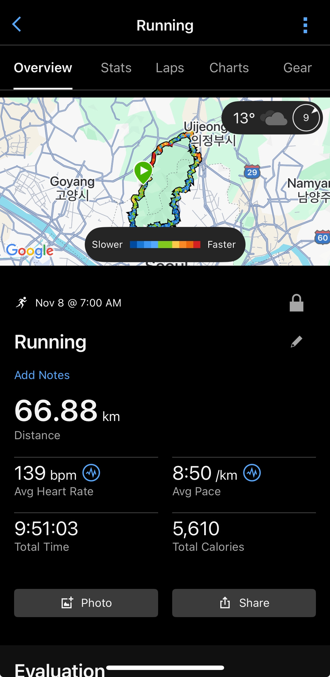 - 총 세 번 알바 중 두 번은 몇 백 미터만 지나쳐 빠르게 수습했지만 한 번은 크게 돌아갔던 탓에 거의 3km 가까이 손해 봤다. GPS 기준 최종 거리 63km 정도라고 하던데 66km 넘게 나왔다.
