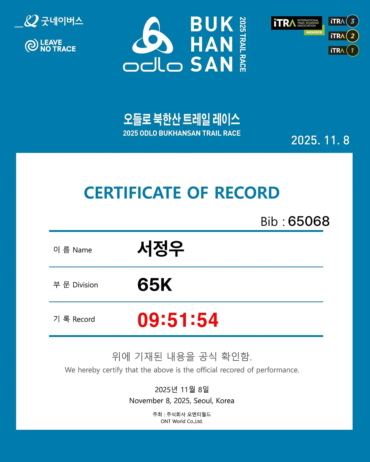 - 참고로 이번에 참가한 오들로 북한산 트레일 레이스는 ITRA 포인트만 지급되고 UTMB 인덱스는 없다 ㅋ